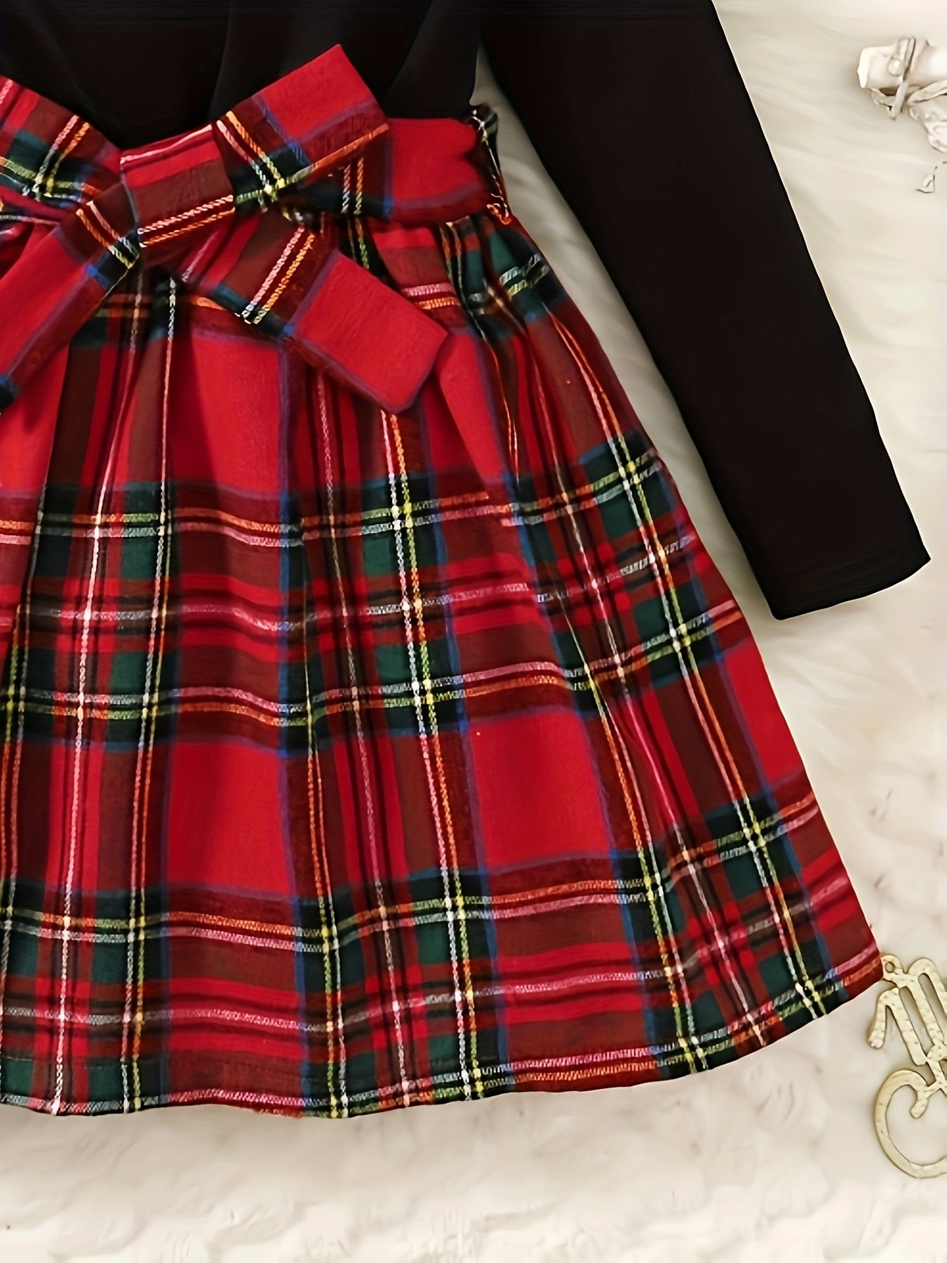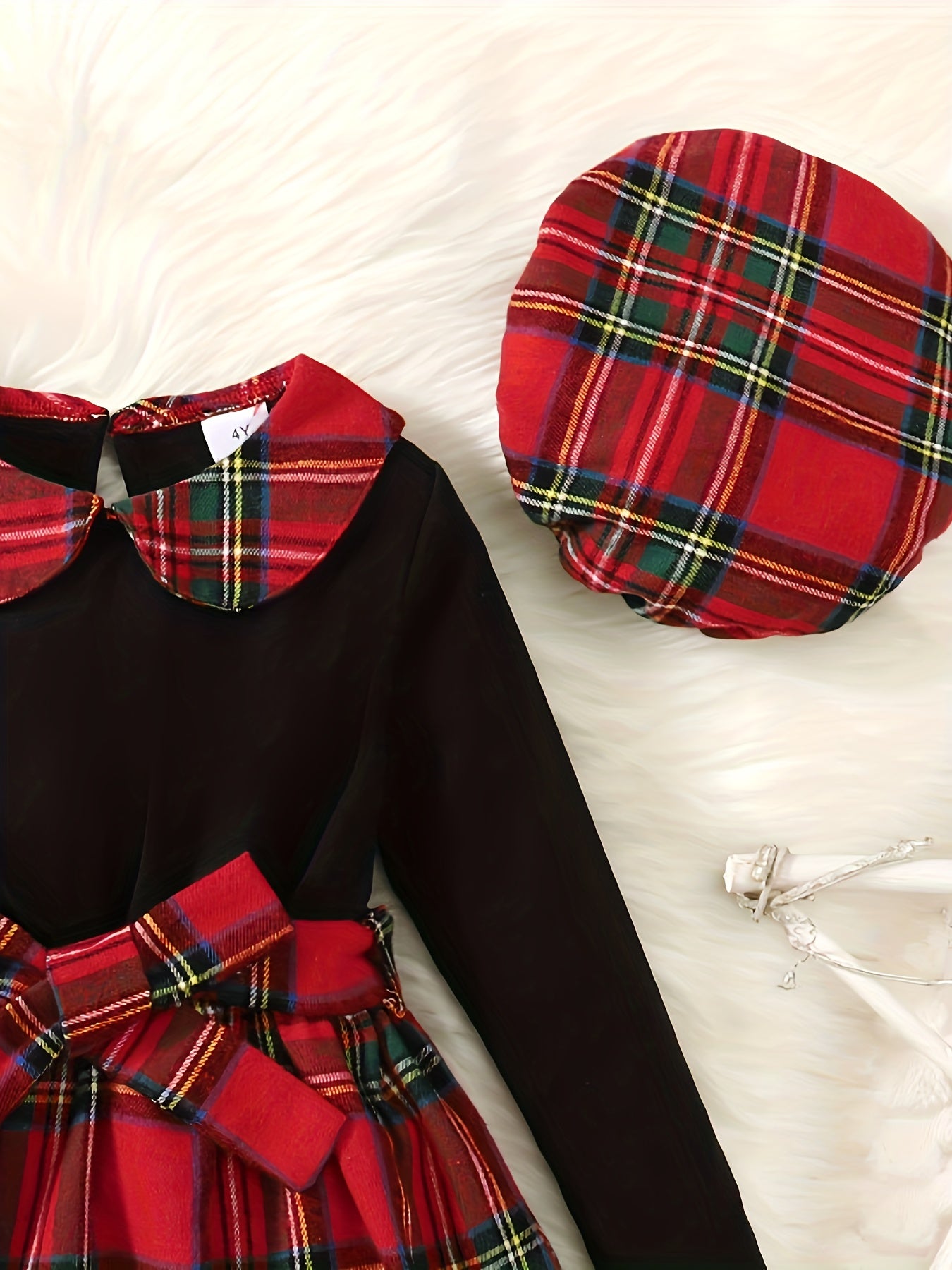 2-Piece Christmas Dress Set for Girls - Splicing Plaid Dress with Bow Belt and Plaid Beret Hat - Perfect for Fall Party, Holiday Outfit, and Winter Fashion for Kids