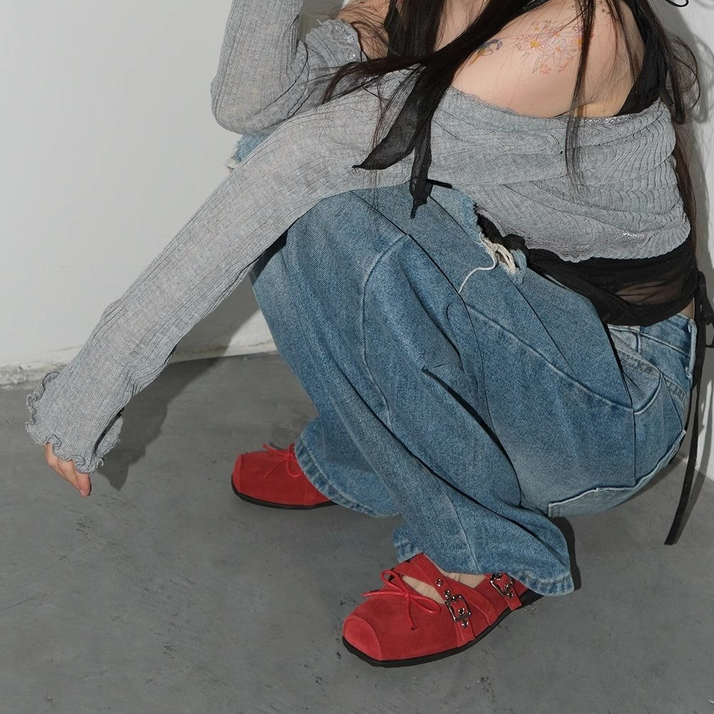 2025 2025 spring new red bow small single shoes women's spring and summer leather retro shallow mouth rivet ballet flats