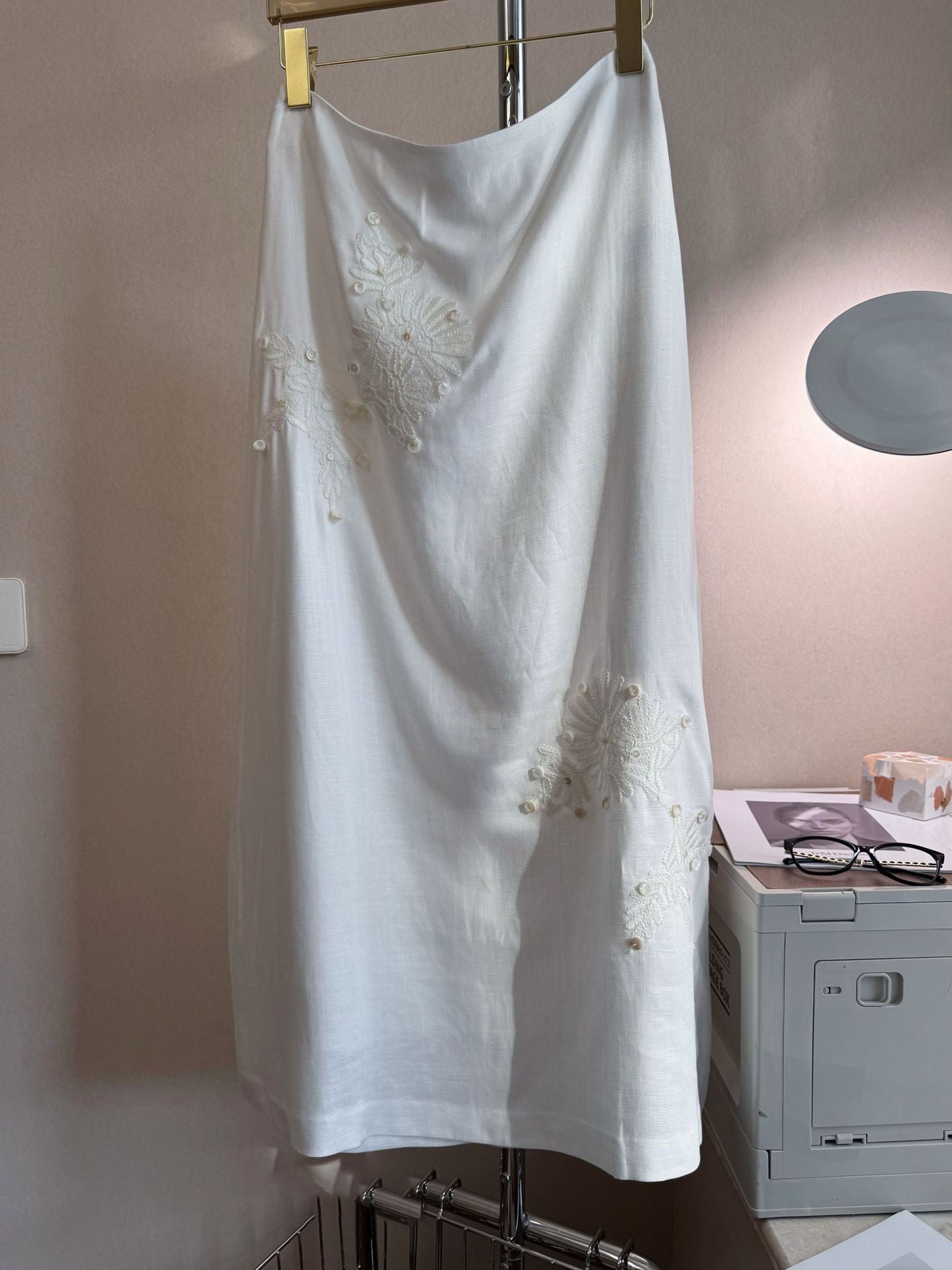 2025 25 spring and summer glossy silk and hemp heavy industry embroidery shell high waist zipper long white hip skirt straight skirt