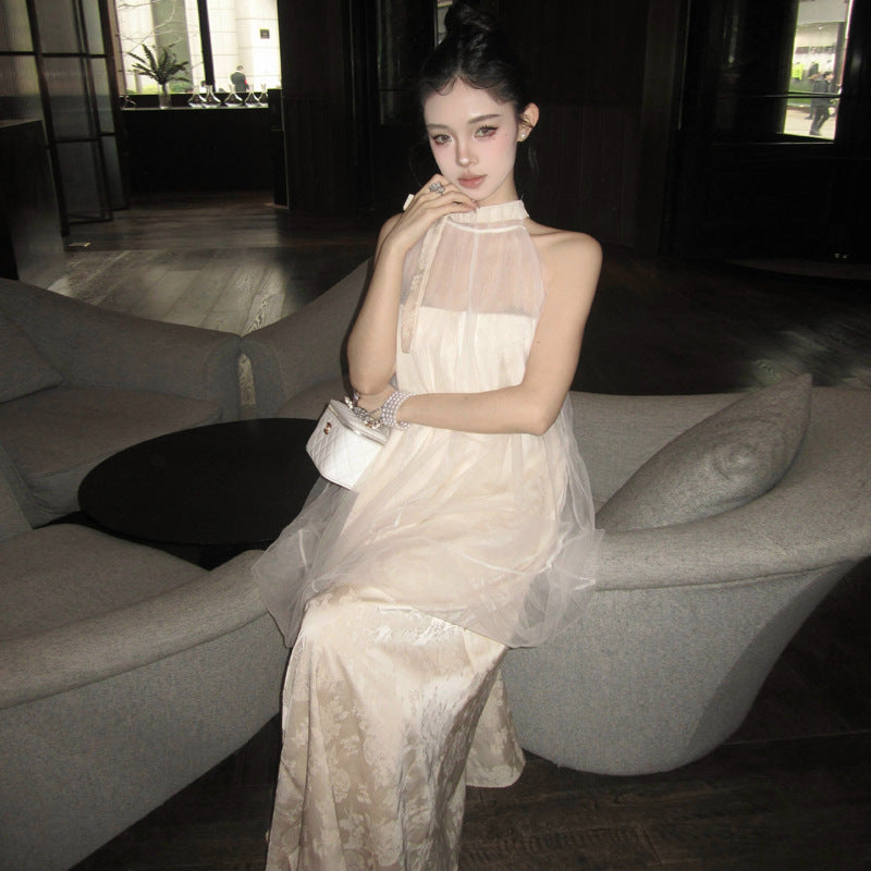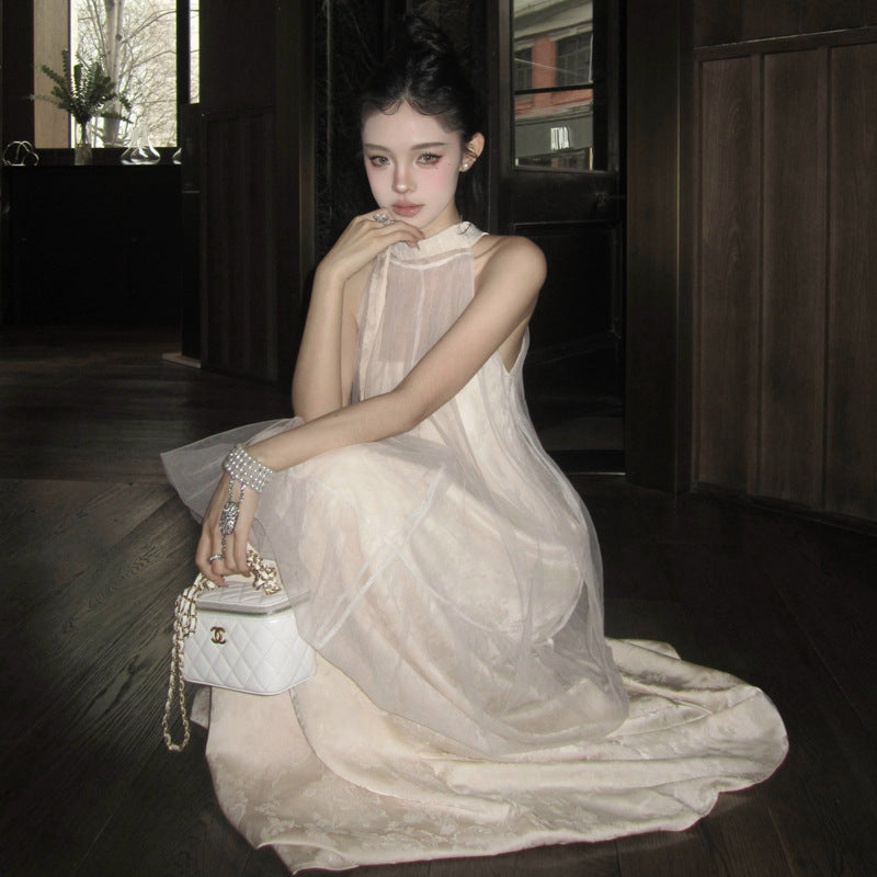 2025 Bohemian vacation wind lace-up bud long dress jacquard fake two pieces loose neck print dress women's summer