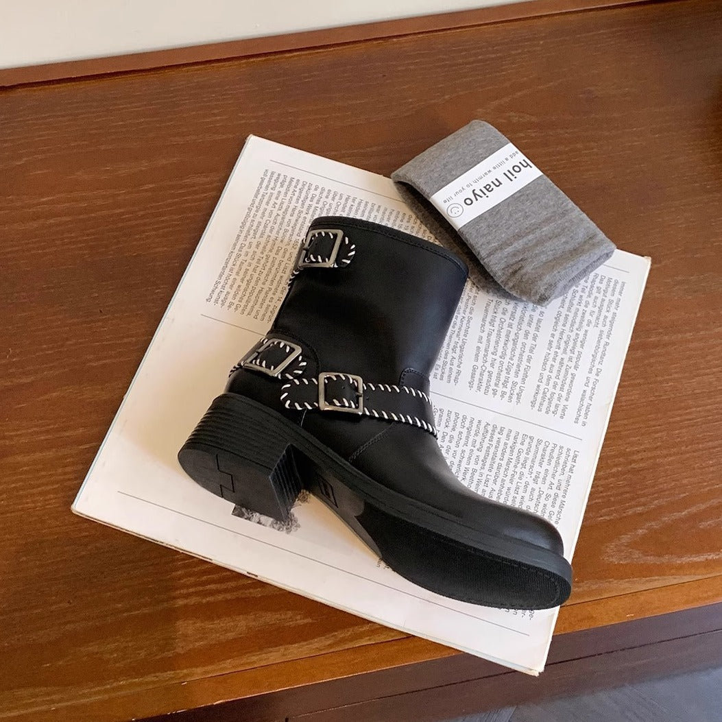 2025 Cowhide version~ Grape mother has the same retro colored belt buckle, old thick heel locomotive British style round head short boots for women