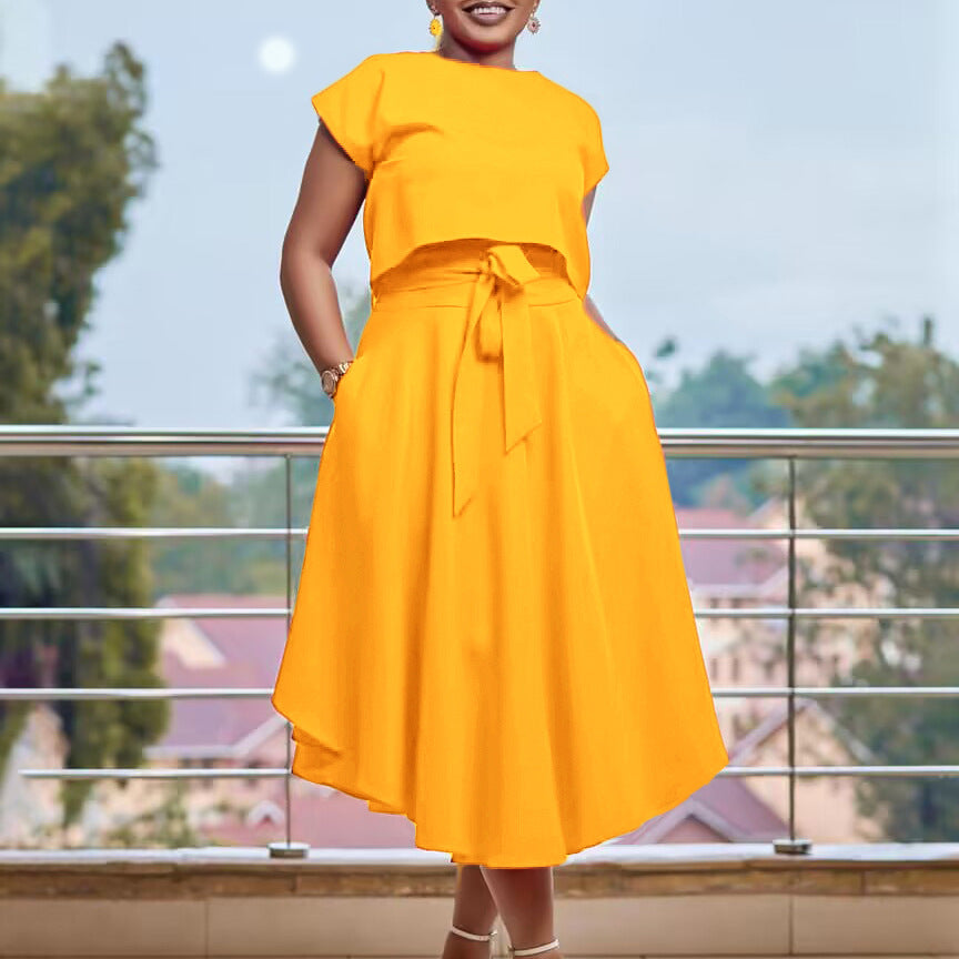 2025 D376 New large-size women's clothing, new temperament Tongle solid color top, large pendulum skirt, two-piece Popular trade suit