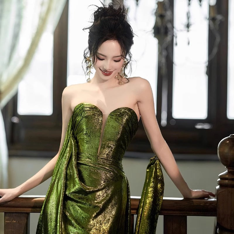 2025 Green tube top morning gown fishtail sequined toast bride wedding engagement sexy halter evening dress birthday party