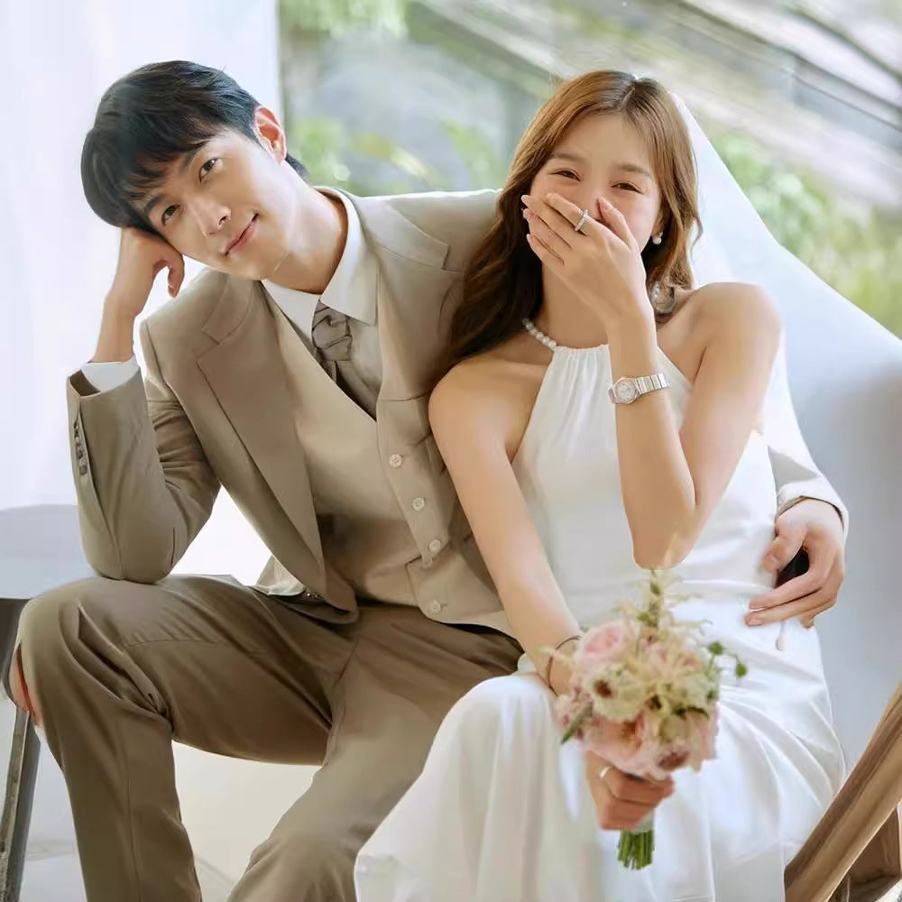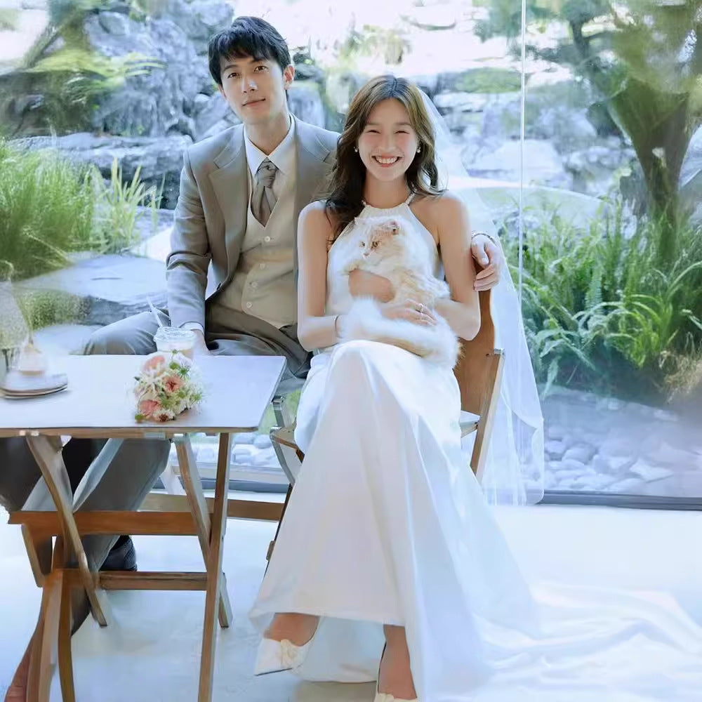 2025 light wedding dress bridal simple temperament white satin pearl neck dress exterior fishtail dress going out yarn