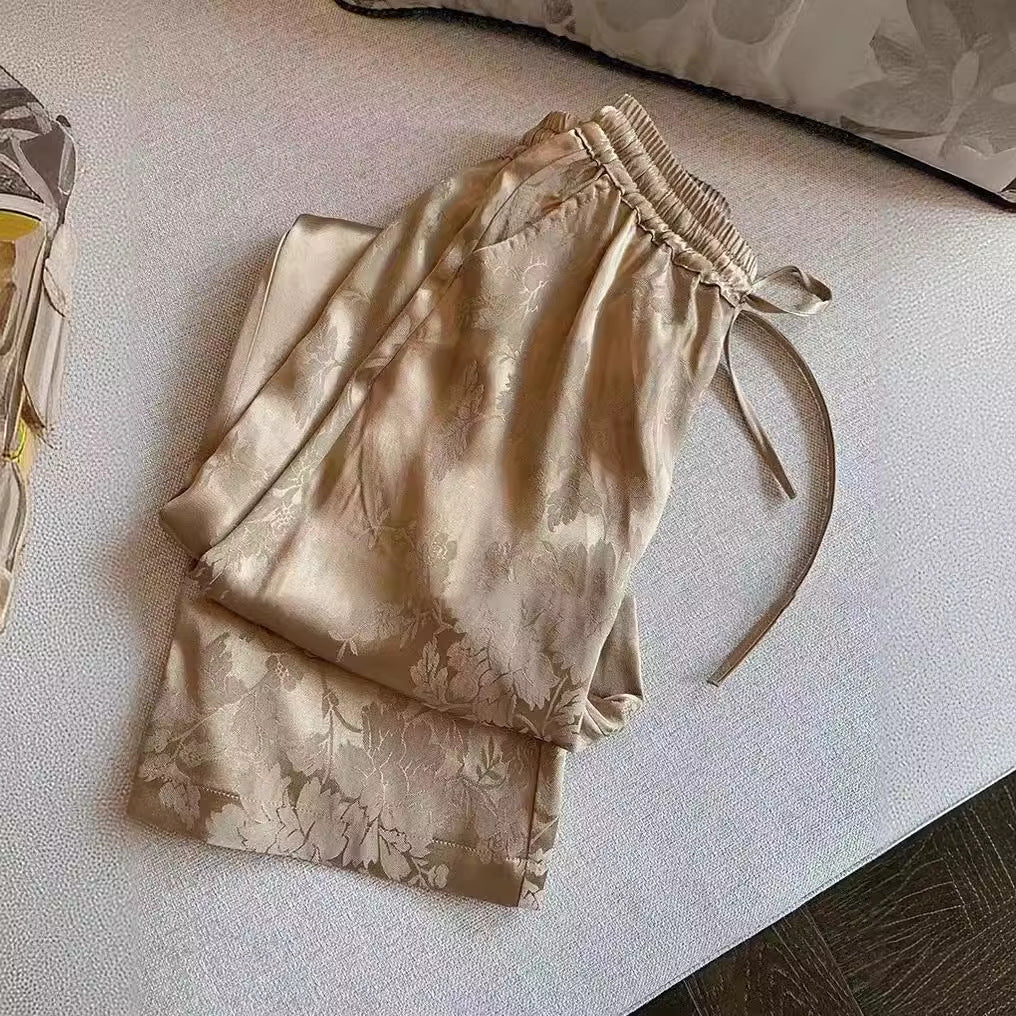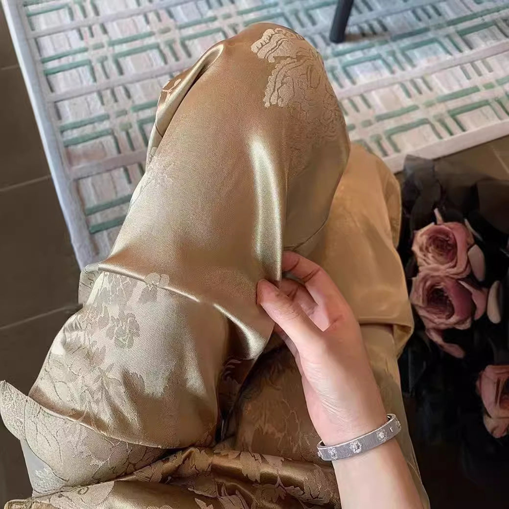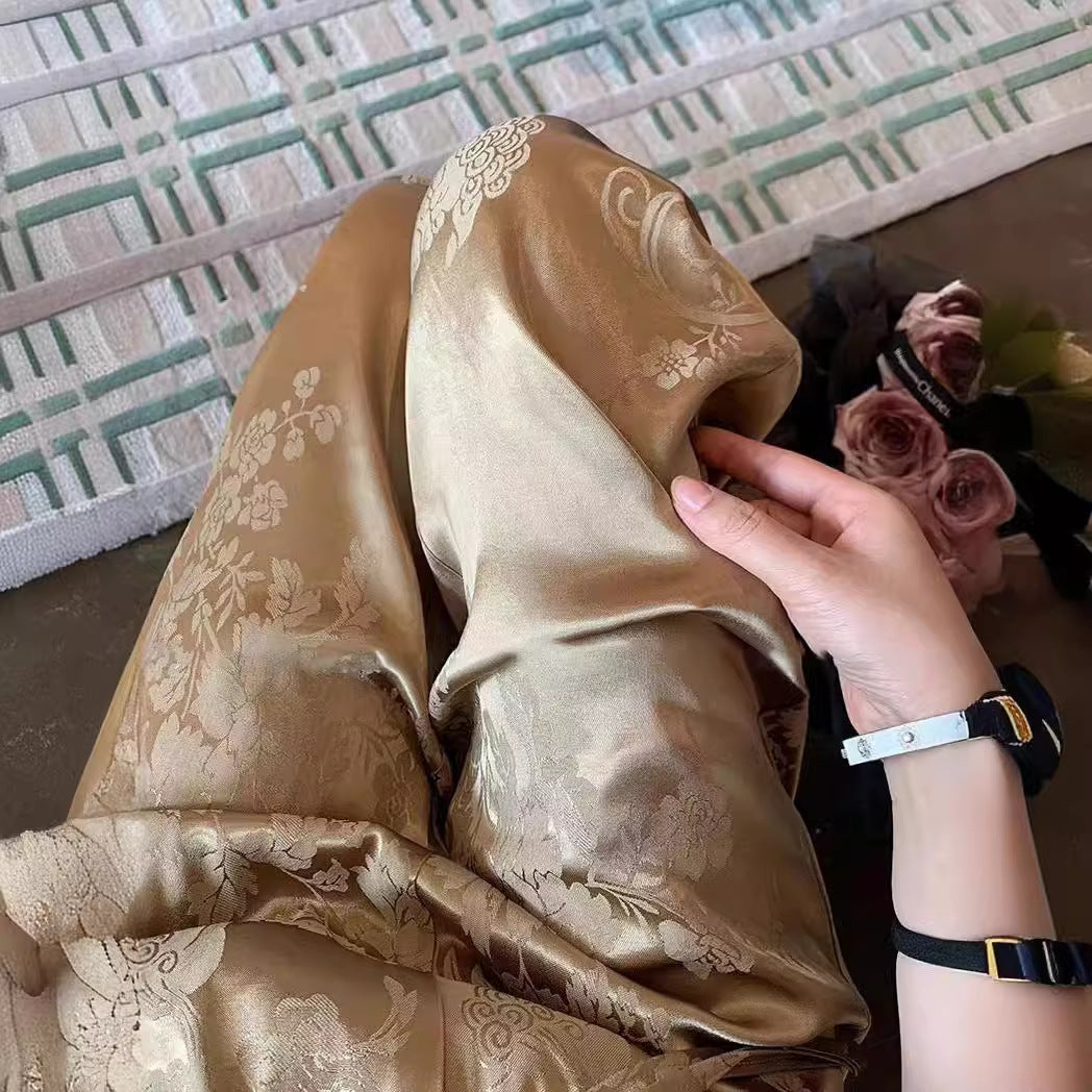 2025 New Chinese retro jacquard imitation acetic acid satin straight casual pants women's spring popular national style high waist drape wide leg pants