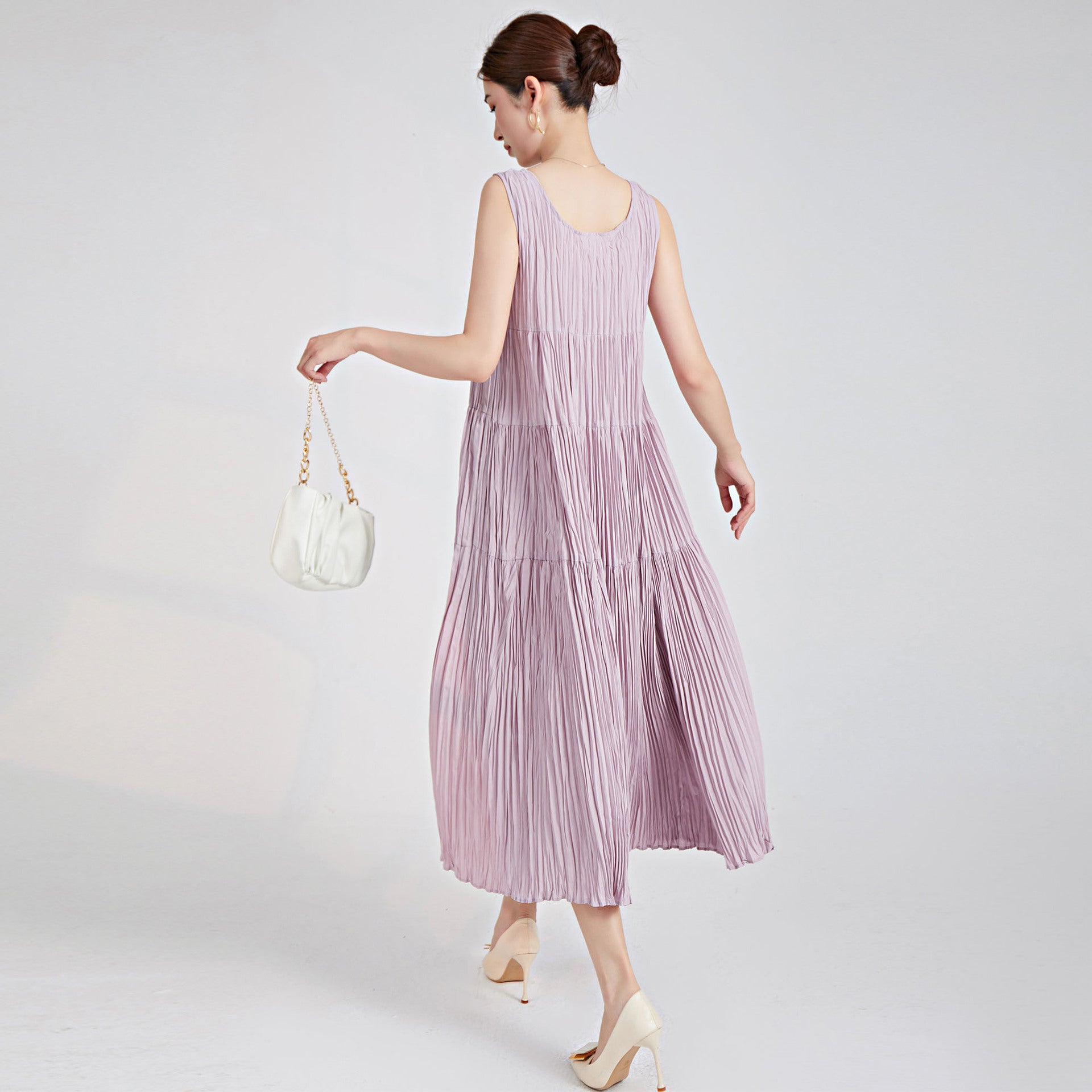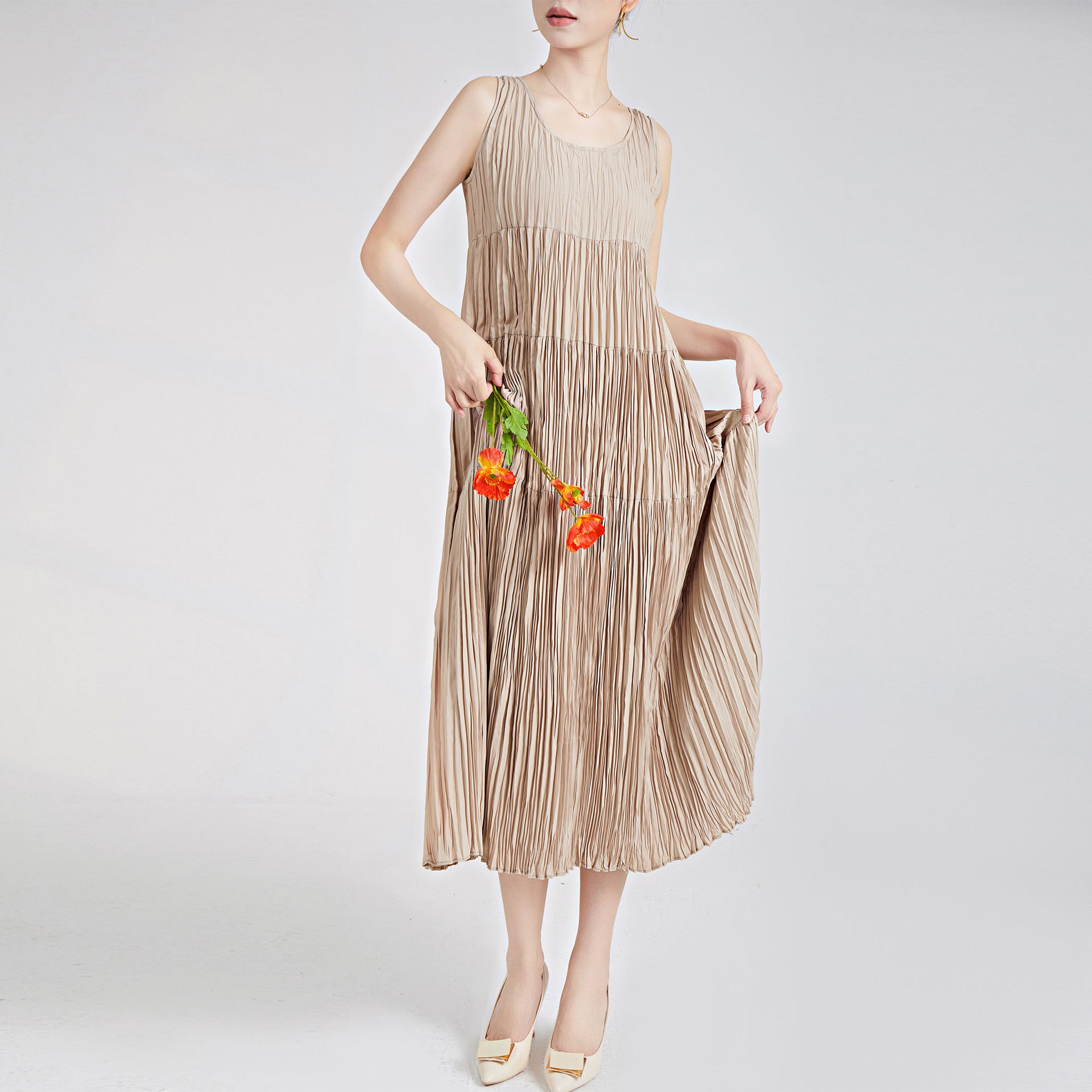 2025 Women's summer dress round neck sleeveless loose drape medium and long a-shaped skirt elegant dress skirt pleated skirt