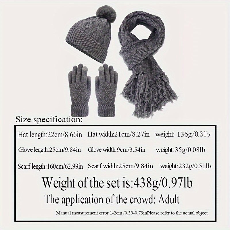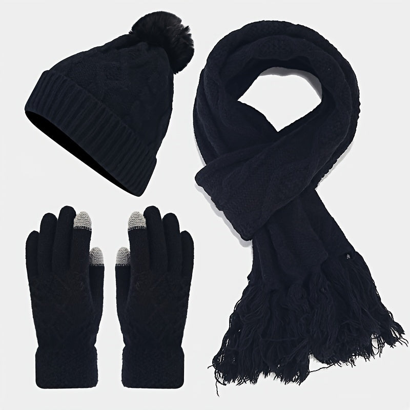 3pcs/set Stylish Twist Knit Winter Accessories - Cold Weather Scarves & Wraps - Soft Beanie, Touchscreen Gloves, and Tassel Scarf Combination for Autumn and Winter Seasons