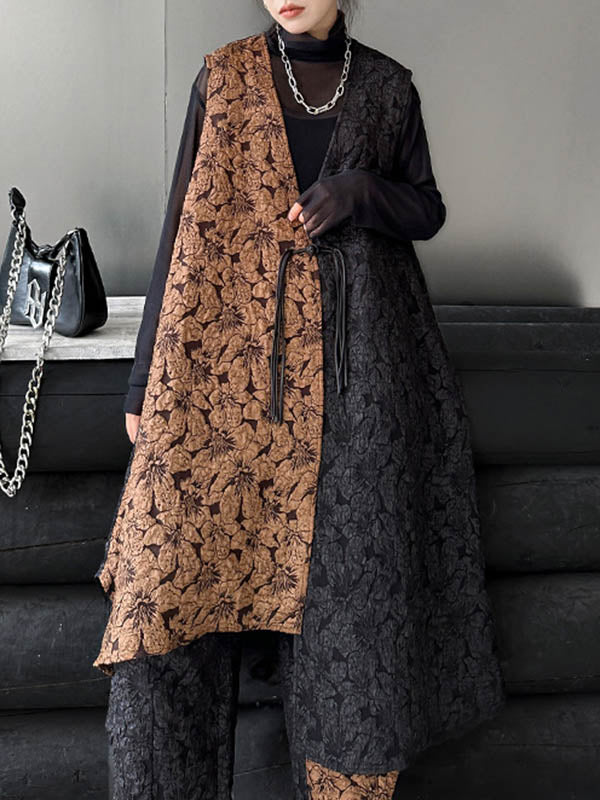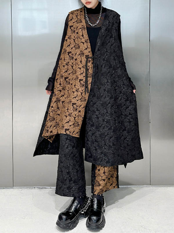 xakxx A-Line High-Low Asymmetric Contrast Color Jacquard Vest Top + Elasticity Pants Bottom Two Pieces Set
