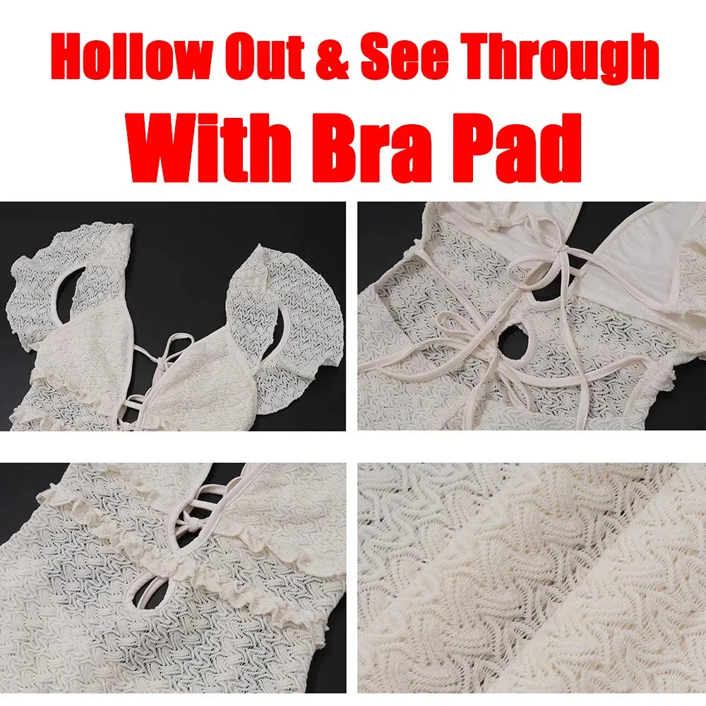 Apricot Hollow Out Maxi Dress Women Sexy See Through Backless Slim Beach Dress Summer Fashion Ruffle Holiday Party Dress 2024