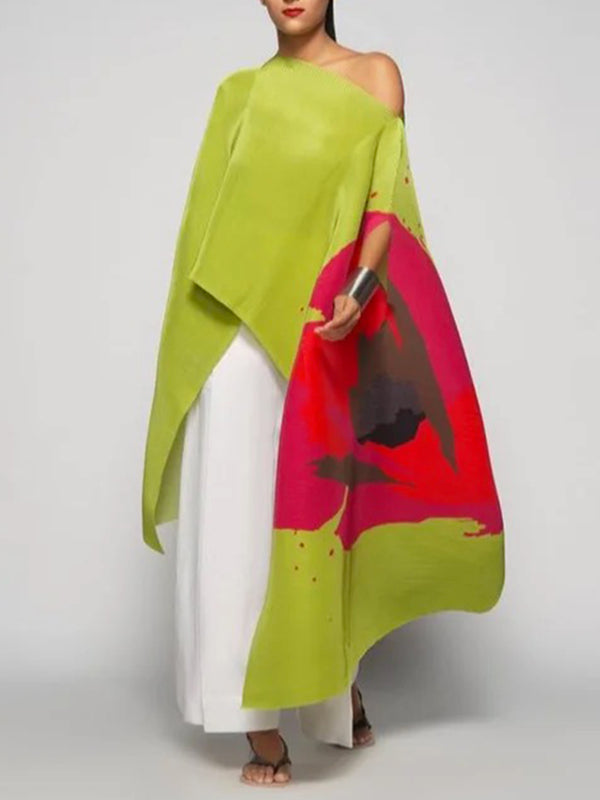 xakxx Batwing Sleeves Irregularity Asymmetric Contrast Color Floral Printed Off-The-Shoulder T-Shirts Tops