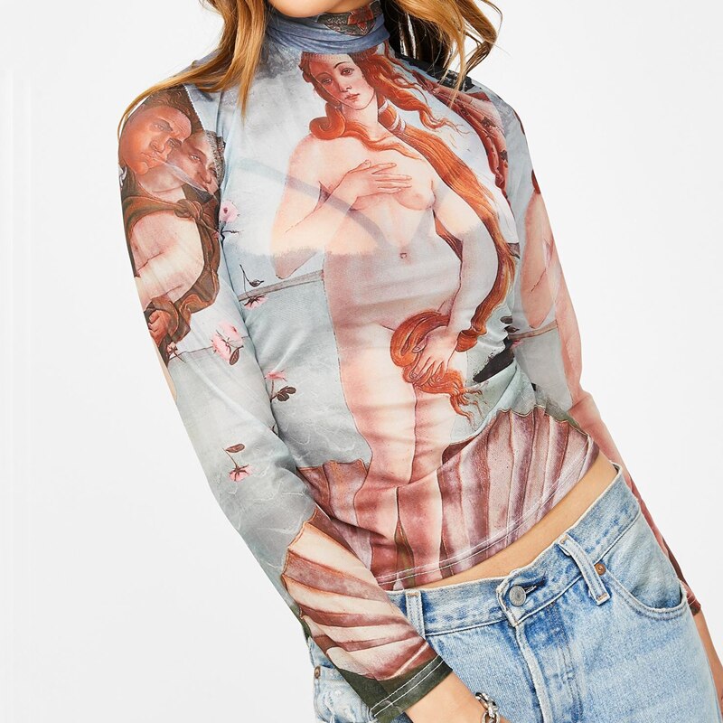 Birth Of Venus Tattoo Mesh Top Long Sleeve Mock Neck Cropped Top Womens T-shirts Sexy Party Club Outfit /