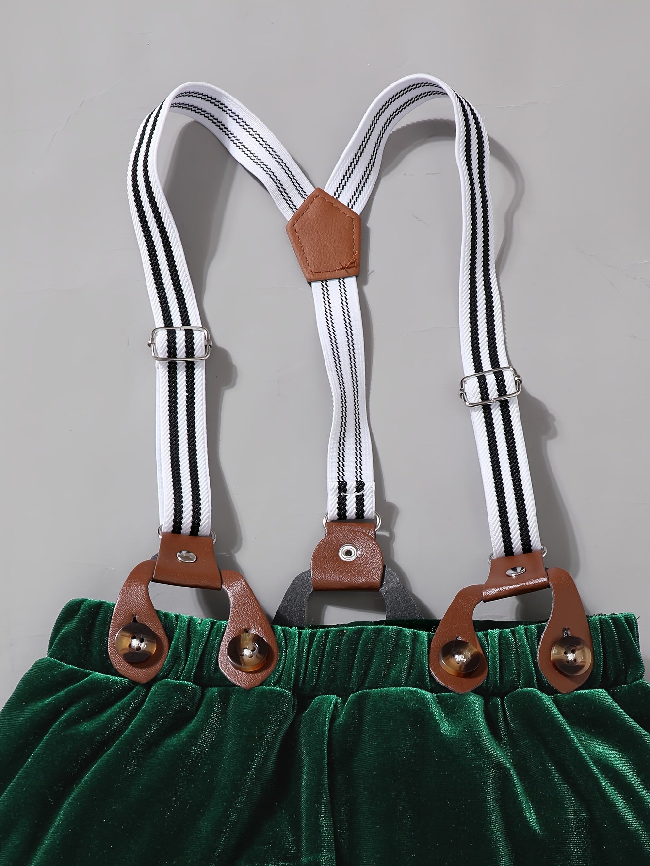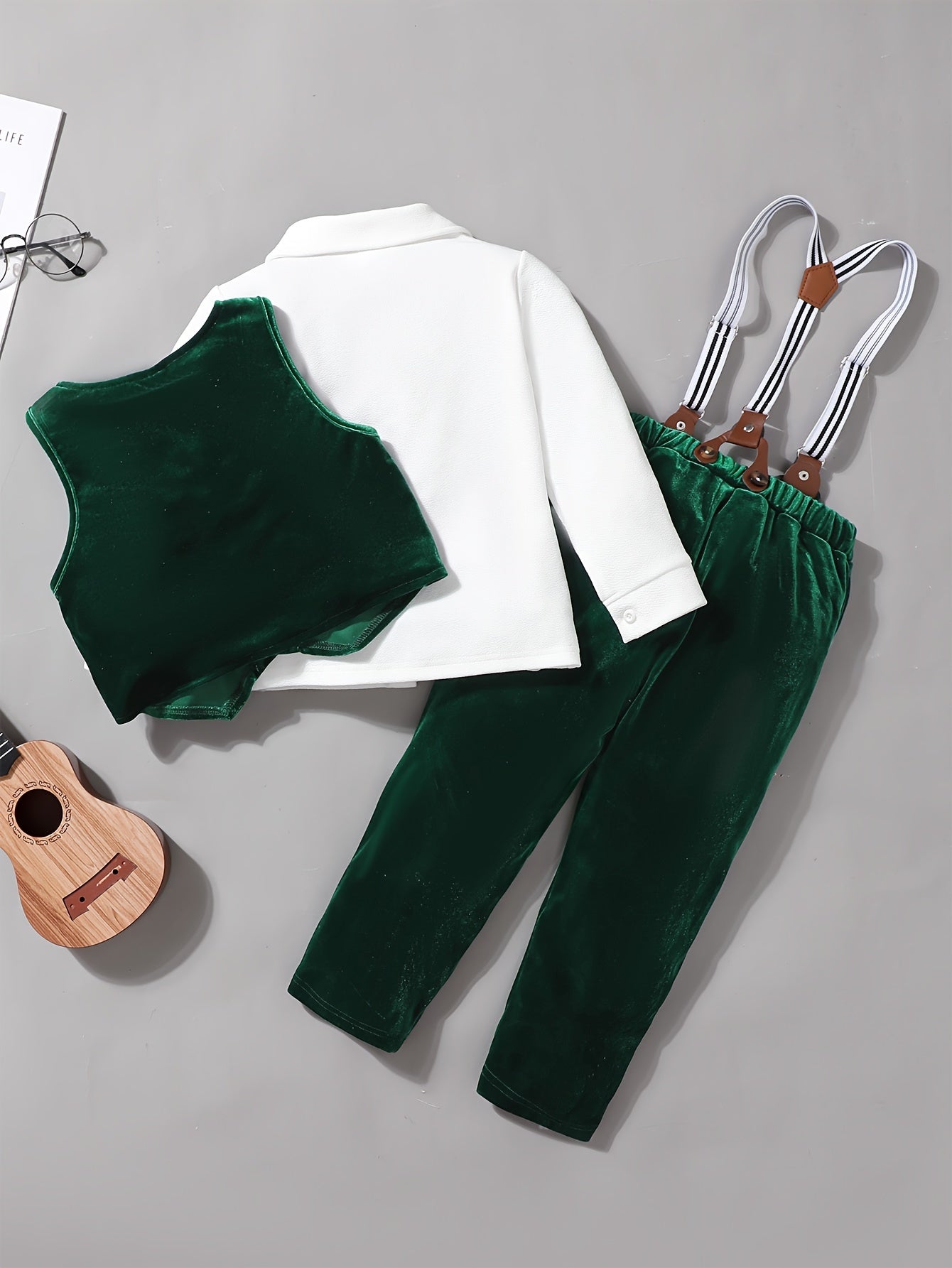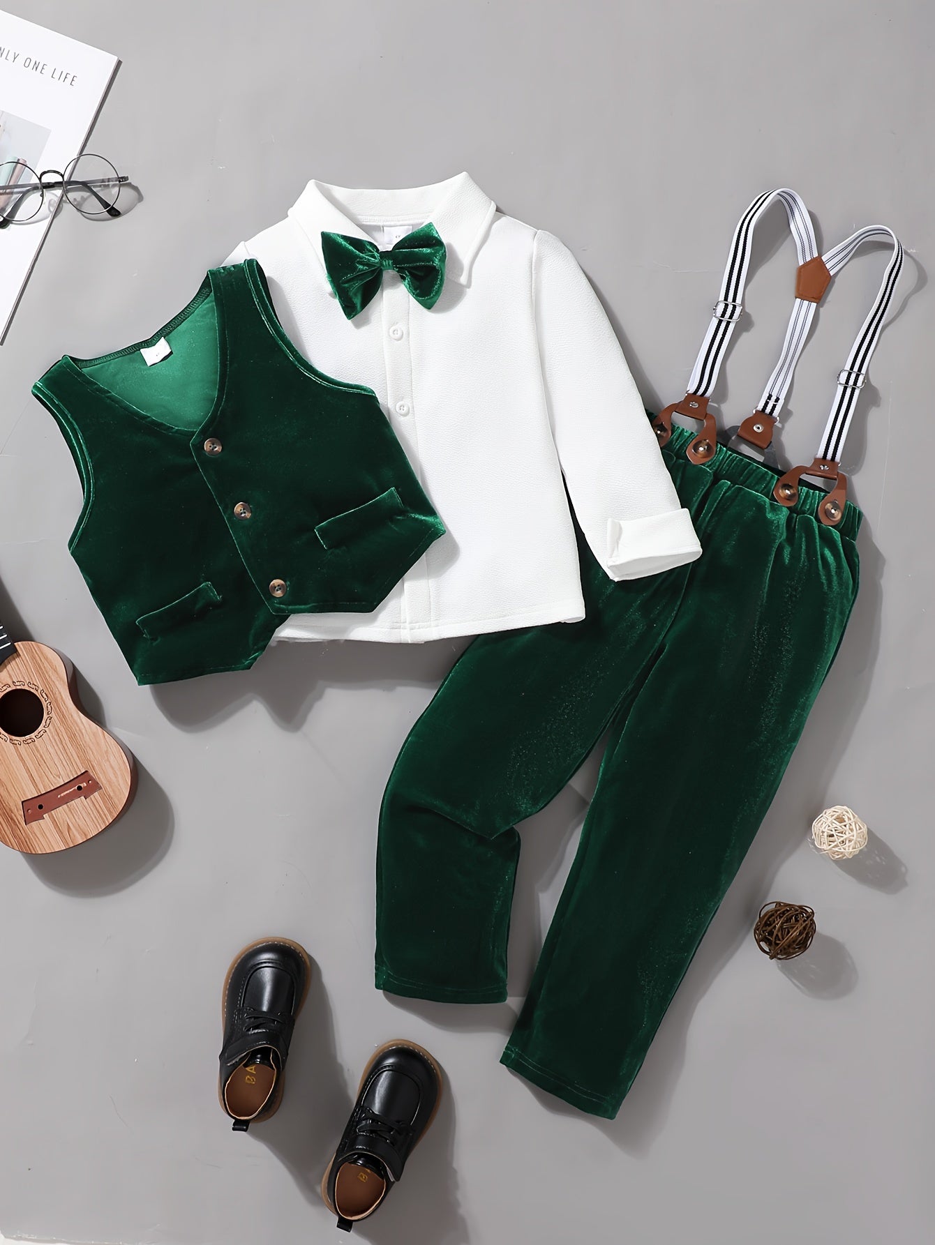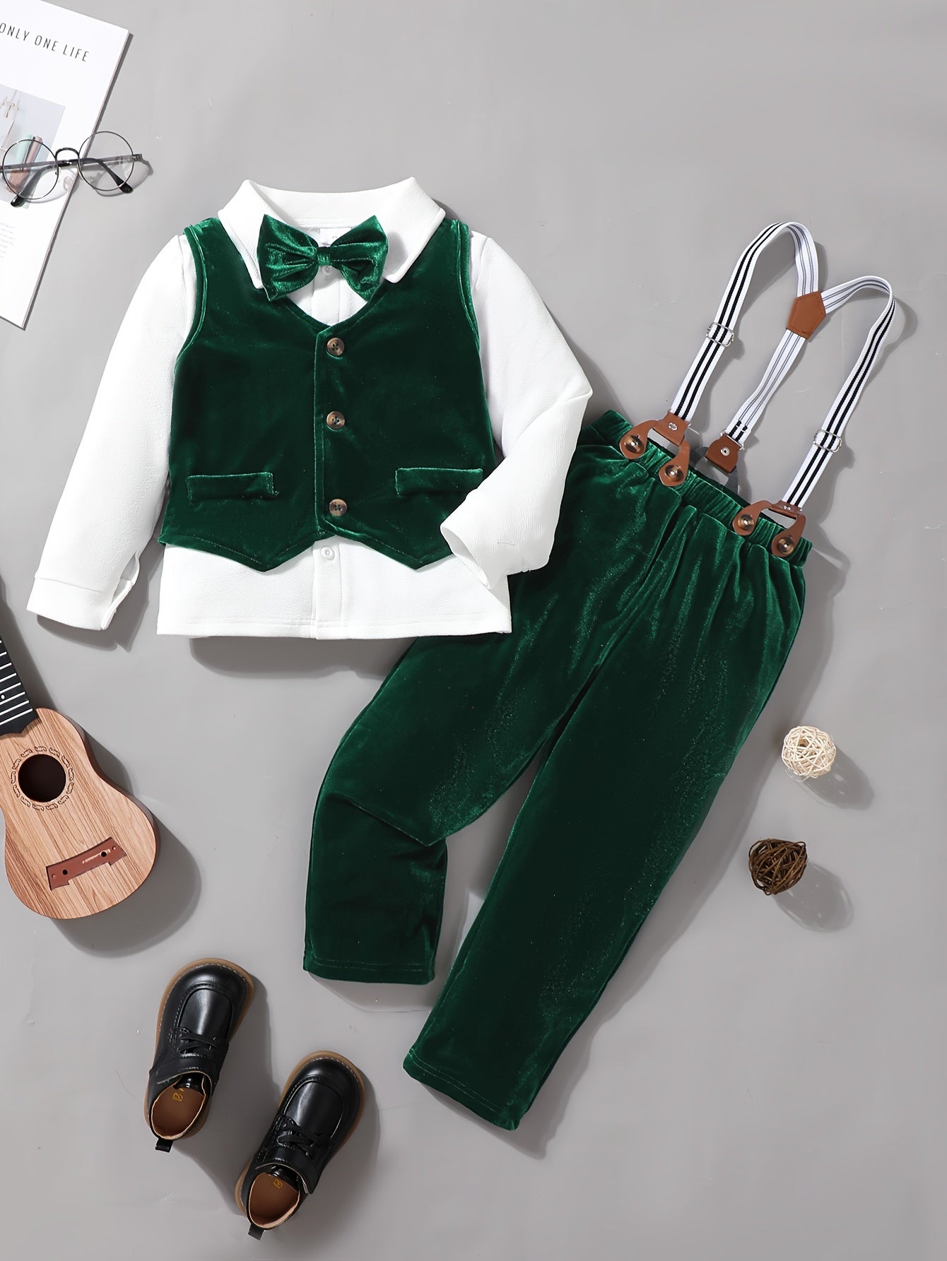 Boys' Velvet Christmas Outfit Set - Long Sleeve Shirt, Detachable Suspender Pants & Vest with Bow Tie | Perfect for Holiday Parties & Gifts