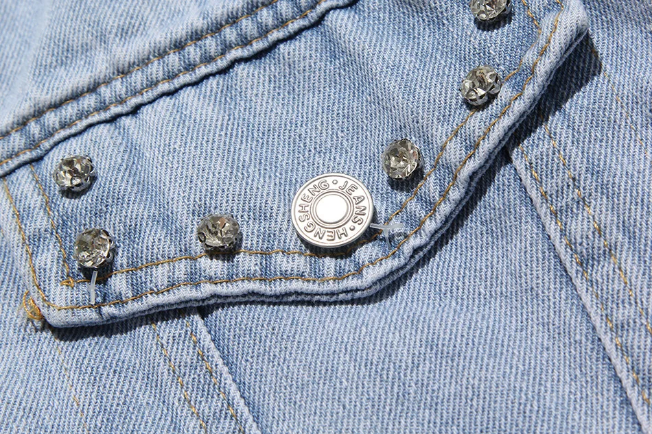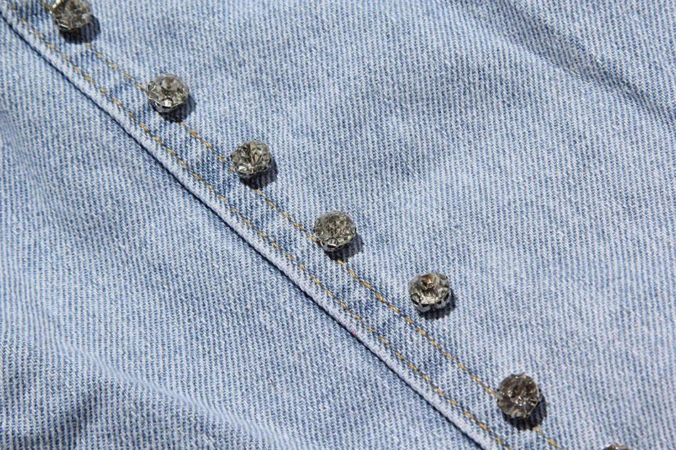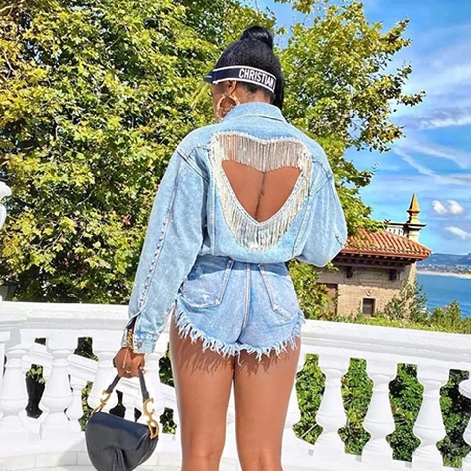 xakxx Denim Jacket Female Light Blue Diamond Tassel Coat Single-Breasted Open Back Women Jeans Coat Autumn Fashion New Clothing