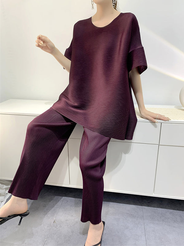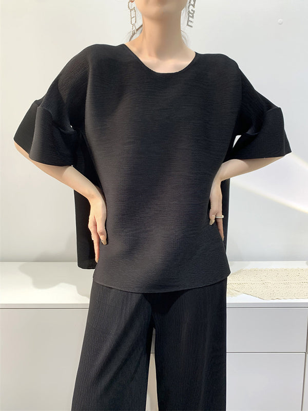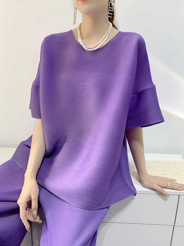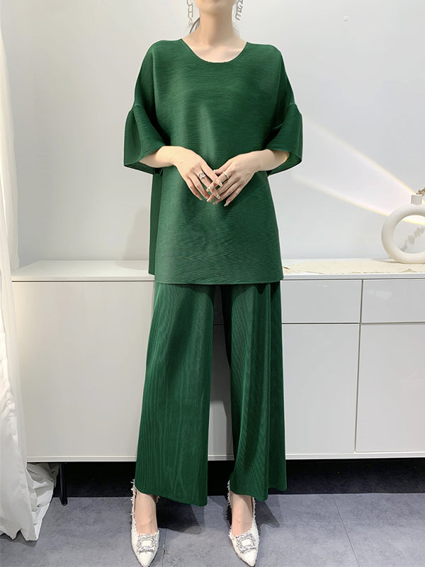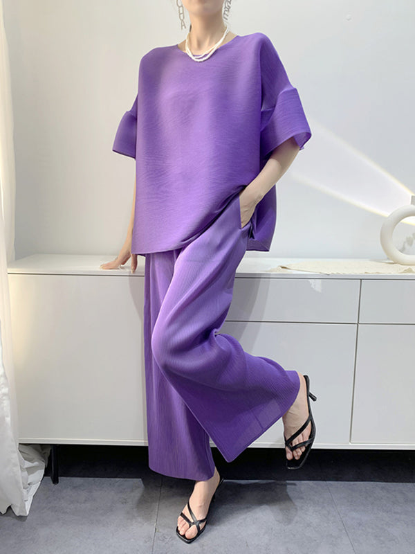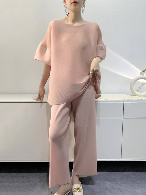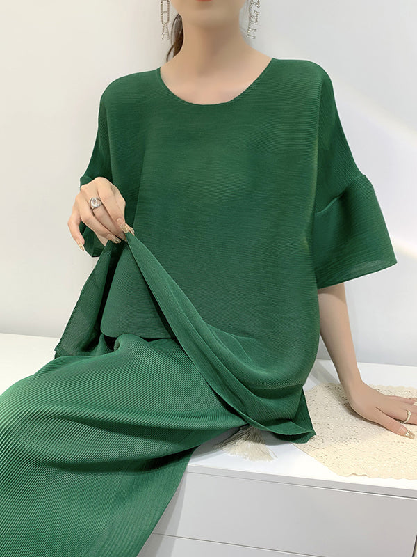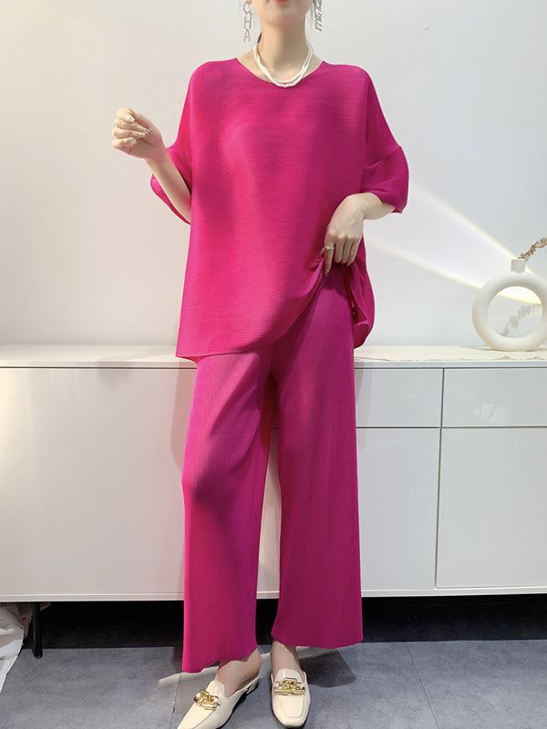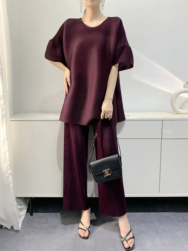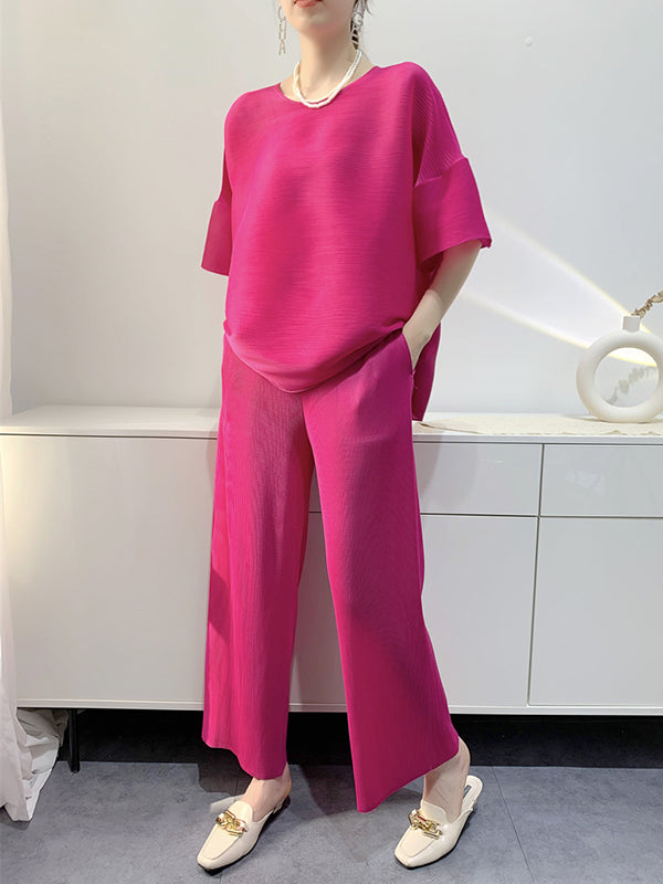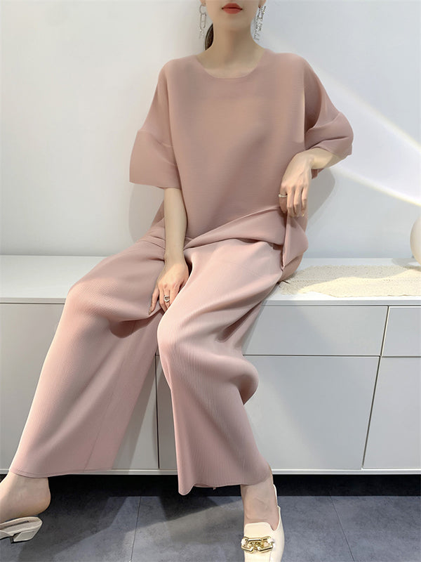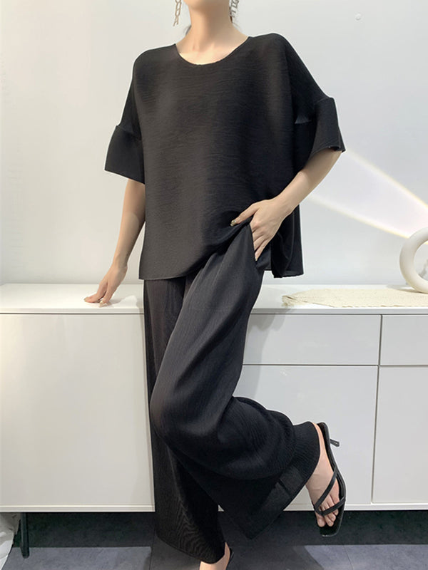 xakxx Elastics Pleated Solid Color Round-Neck T-Shirt + Wide Leg Pants Two Pieces Set
