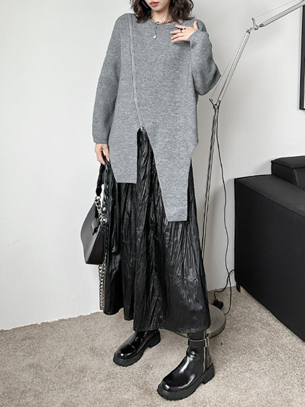 xakxx High-Low Long Sleeves Asymmetric Solid Color Zipper Round-Neck Pullovers Sweater Tops