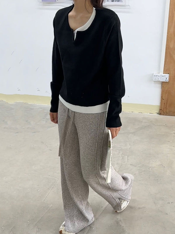 xakxx High Waisted Loose Drawstring Solid Color Split-Side Velvet Pants Trousers