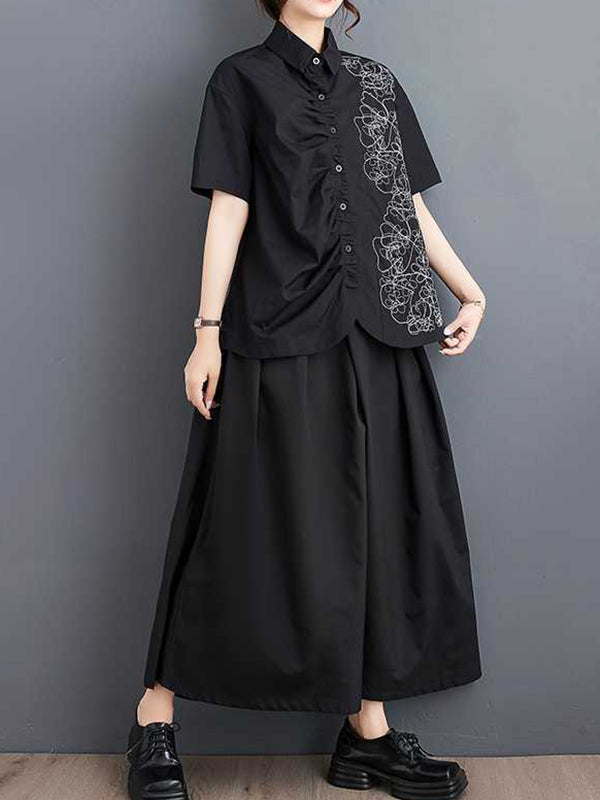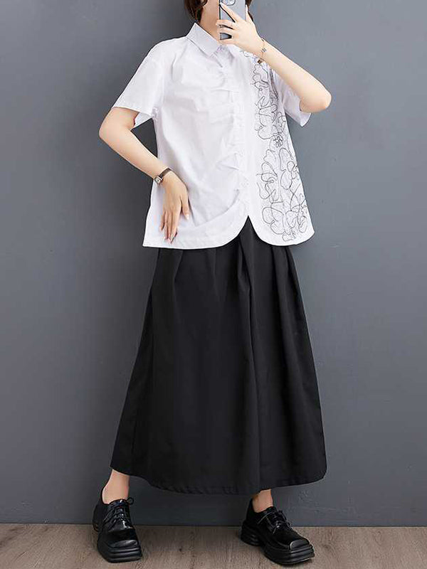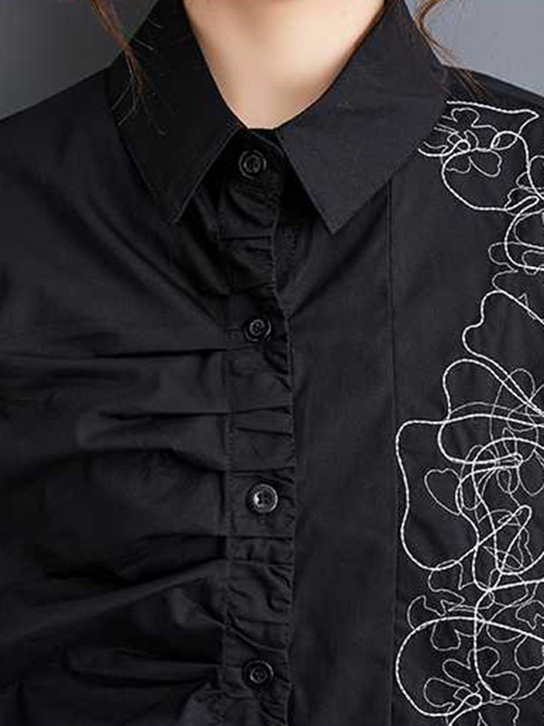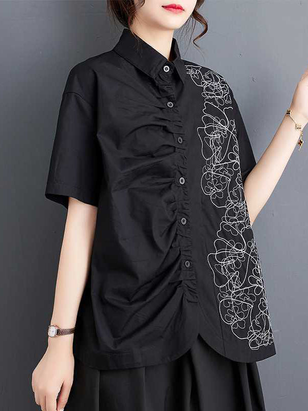 xakxx Irregularity Loose Buttoned Embroidered Pleated Lapel Collar Blouses&Shirts Tops