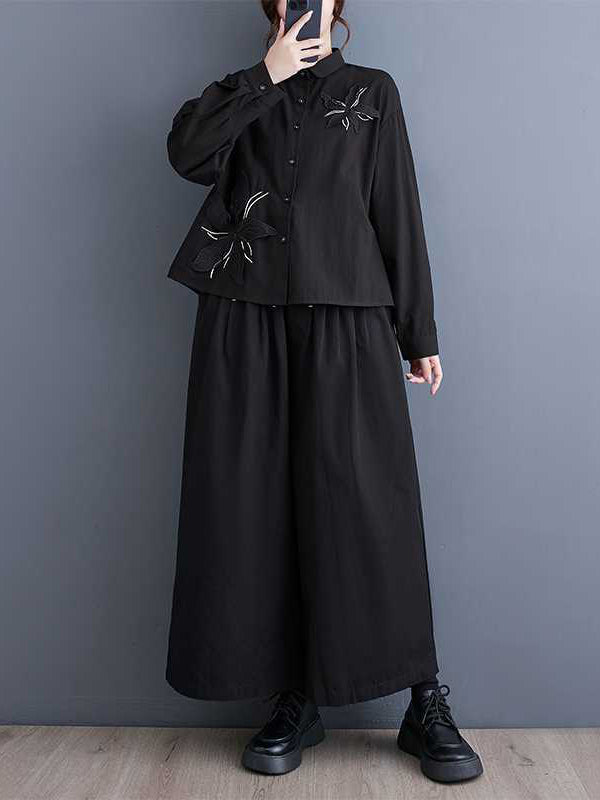 xakxx Long Sleeves Loose Applique Buttoned Embroidered Lapel Blouses&Shirts Tops