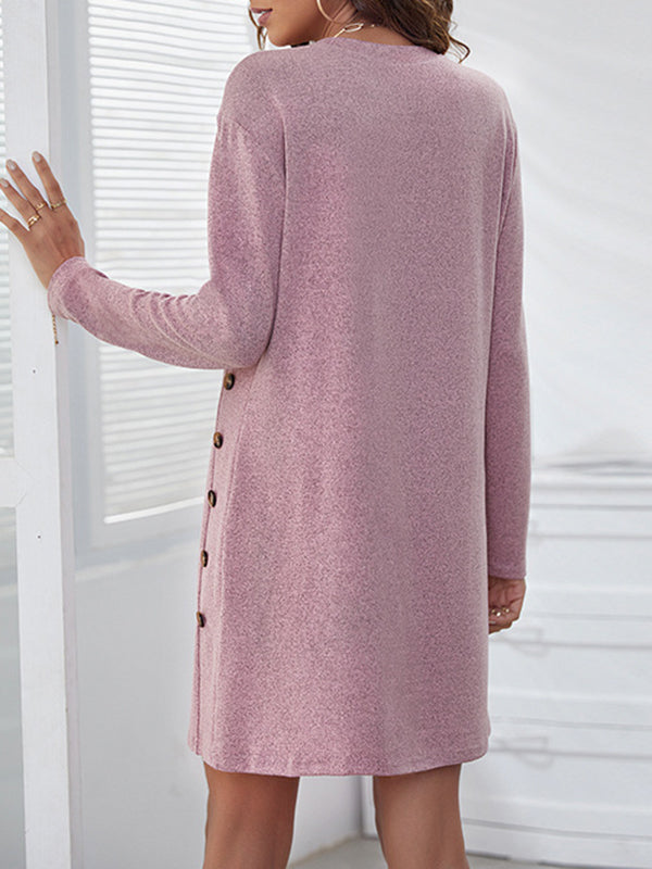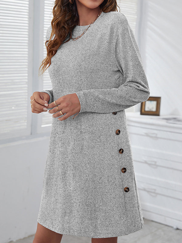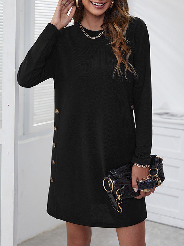 xakxx Long Sleeves Loose Asymmetric Buttoned Round-Neck Mini Dresses