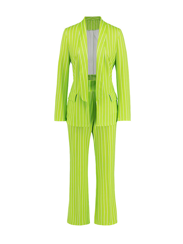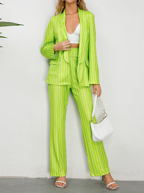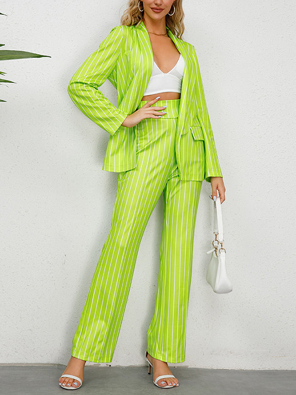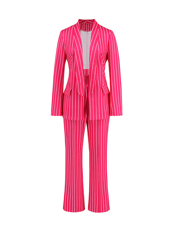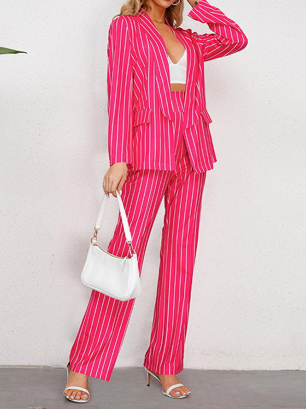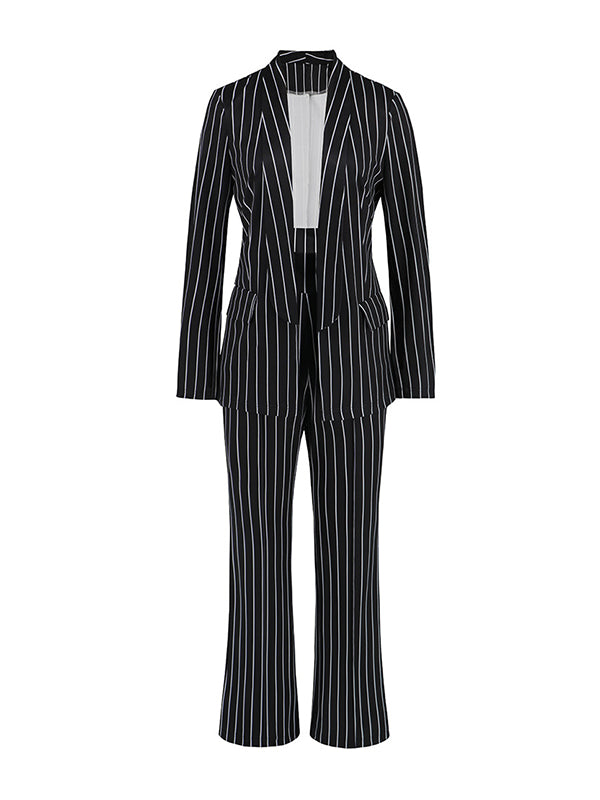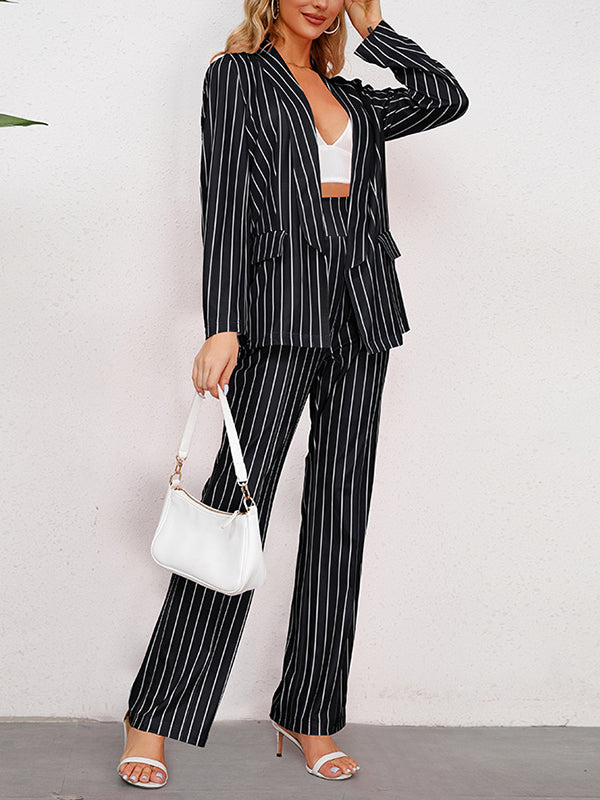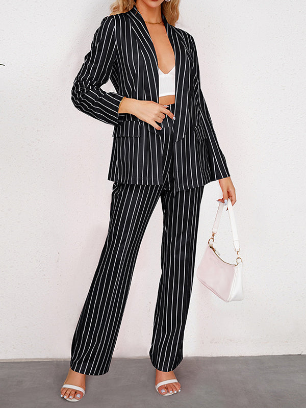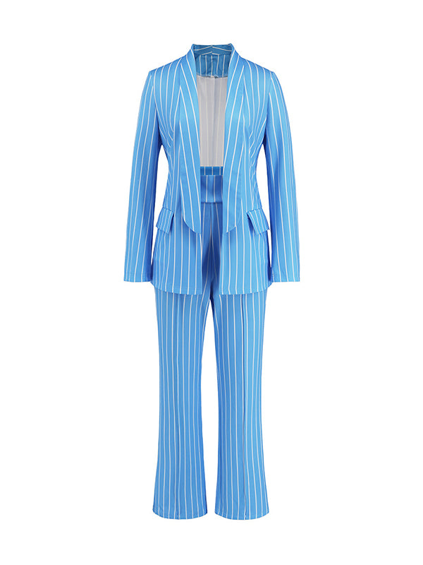 xakxx Long Sleeves Striped Lapel Blazer Top + Wide Leg Pants Bottom Two Pieces Set