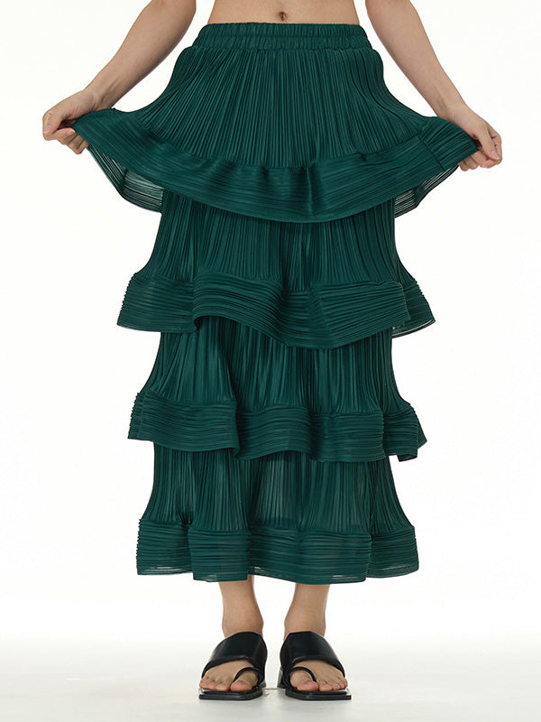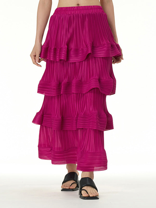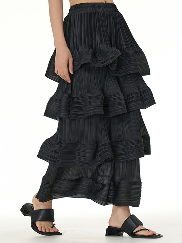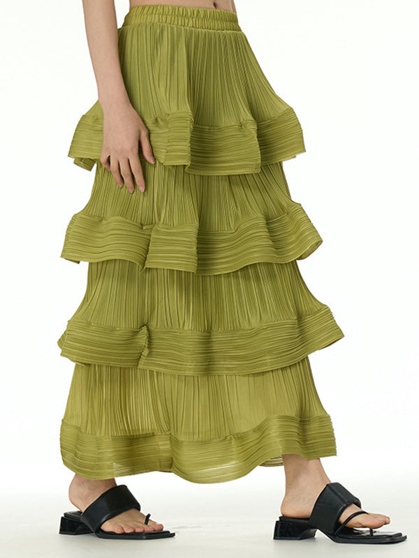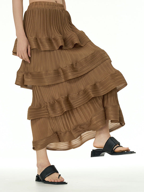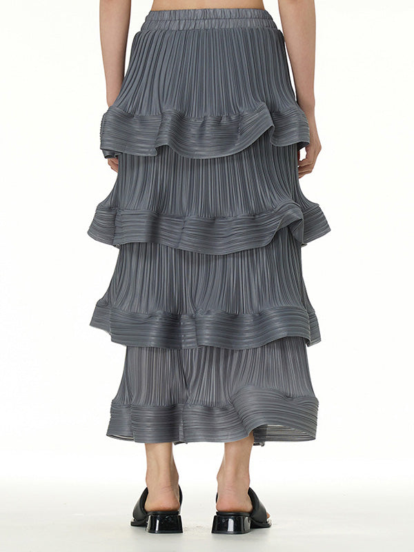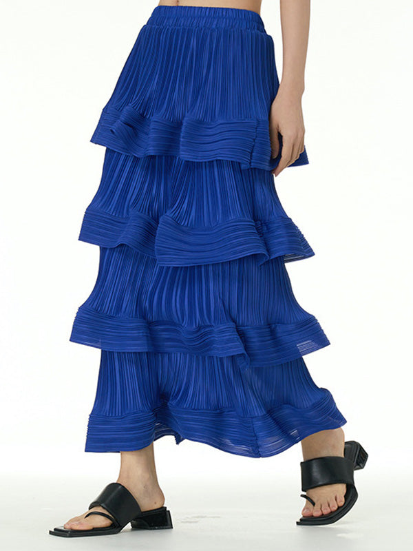 xakxx Loose Elasticity Layered Pleated Ruffled Solid Color Skirts Bottoms