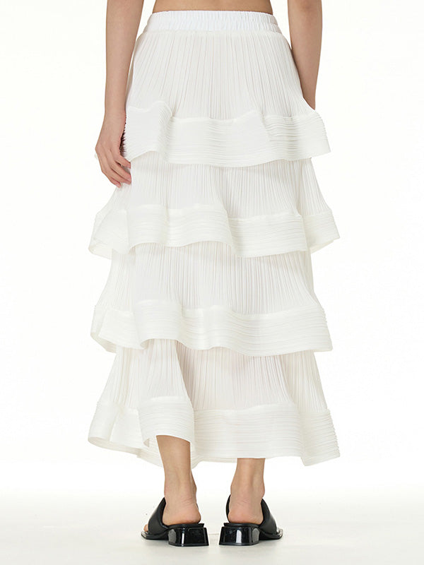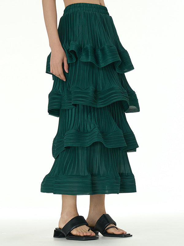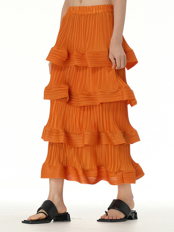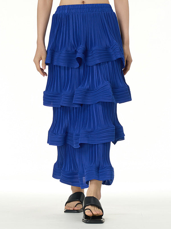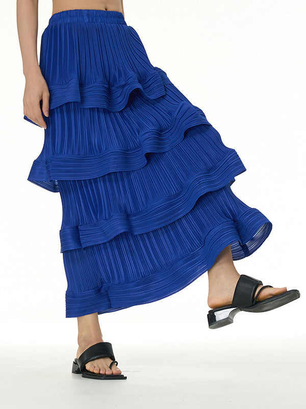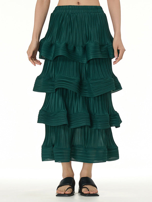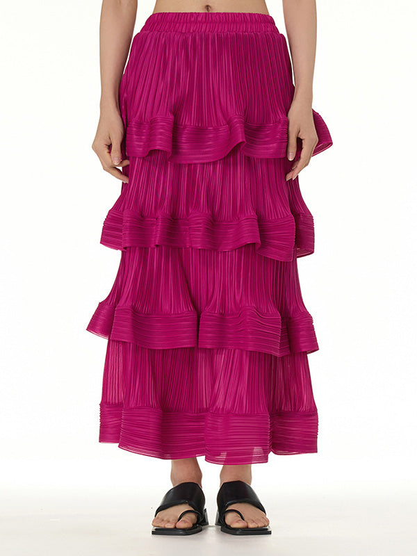 xakxx Loose Elasticity Layered Pleated Ruffled Solid Color Skirts Bottoms