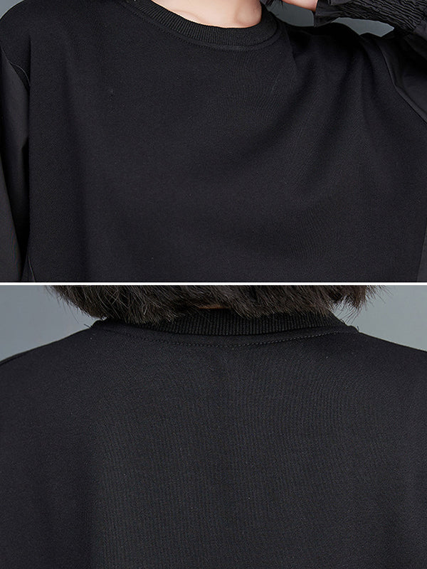xakxx Loose Puff Sleeves Pleated Solid Color Split-Joint Round-neck Midi Dresses
