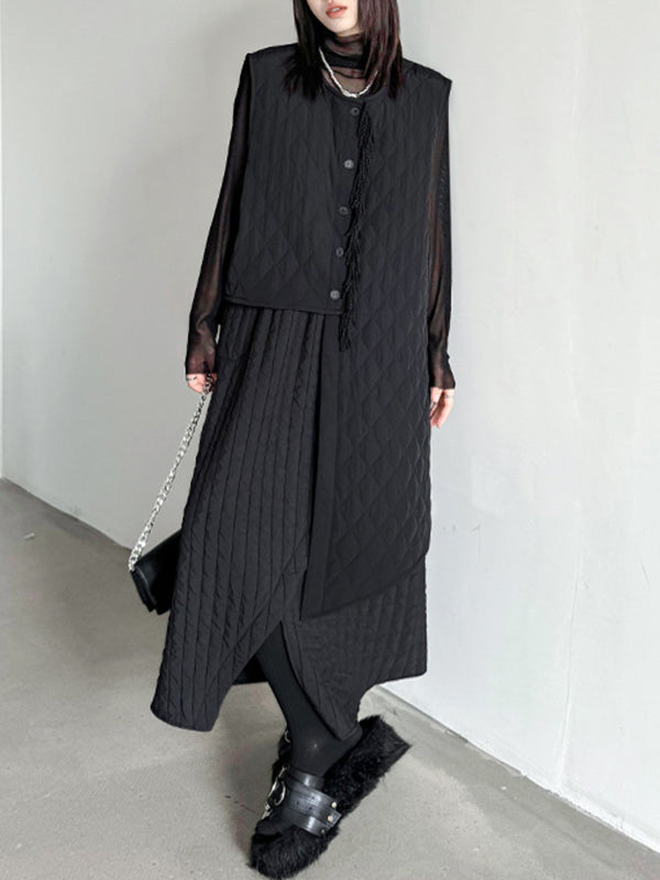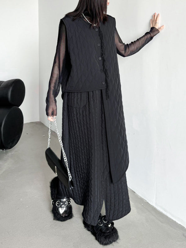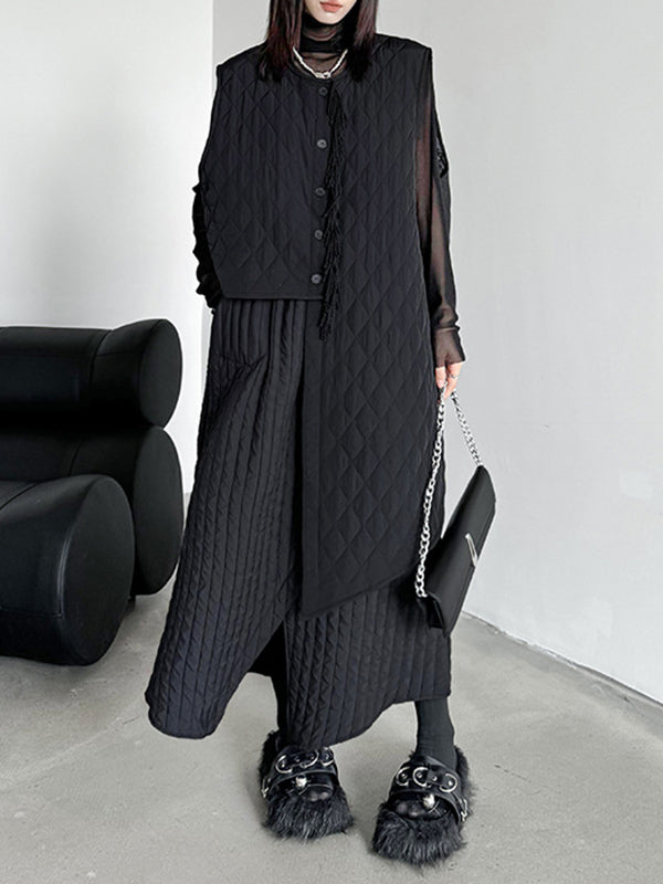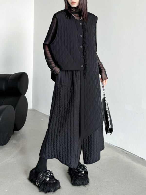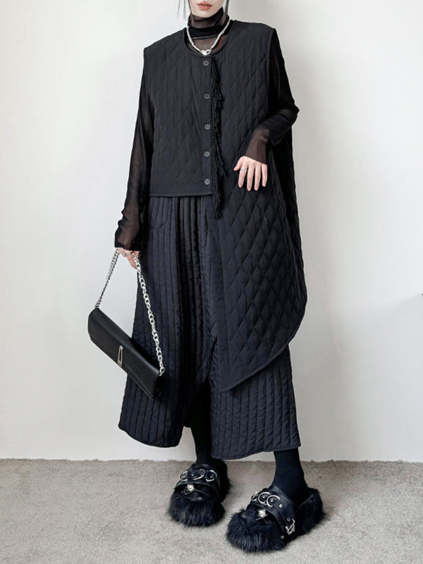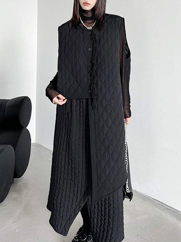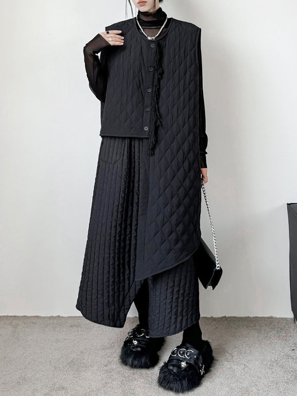 xakxx Loose Sleeveless Asymmetric Buttoned Quilted Solid Color Tasseled U-neck Padded Vest