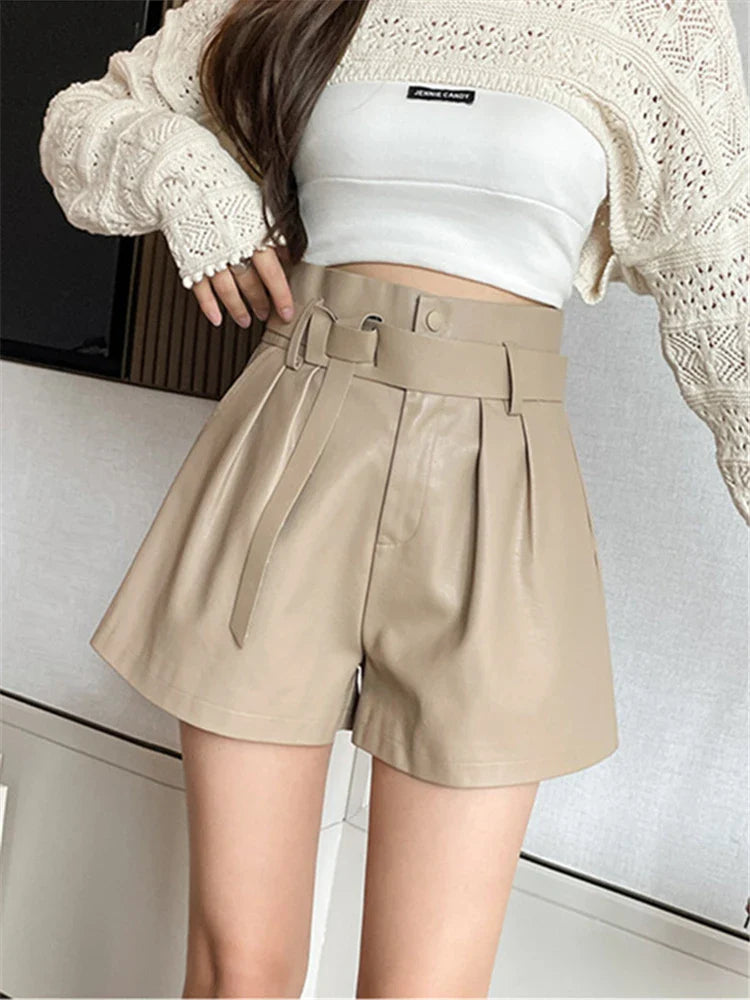 Autumn Winter Women's Faux PU Leather Shorts with Belted New High Waist Ladies Elegant Short Trousers Pocket Female