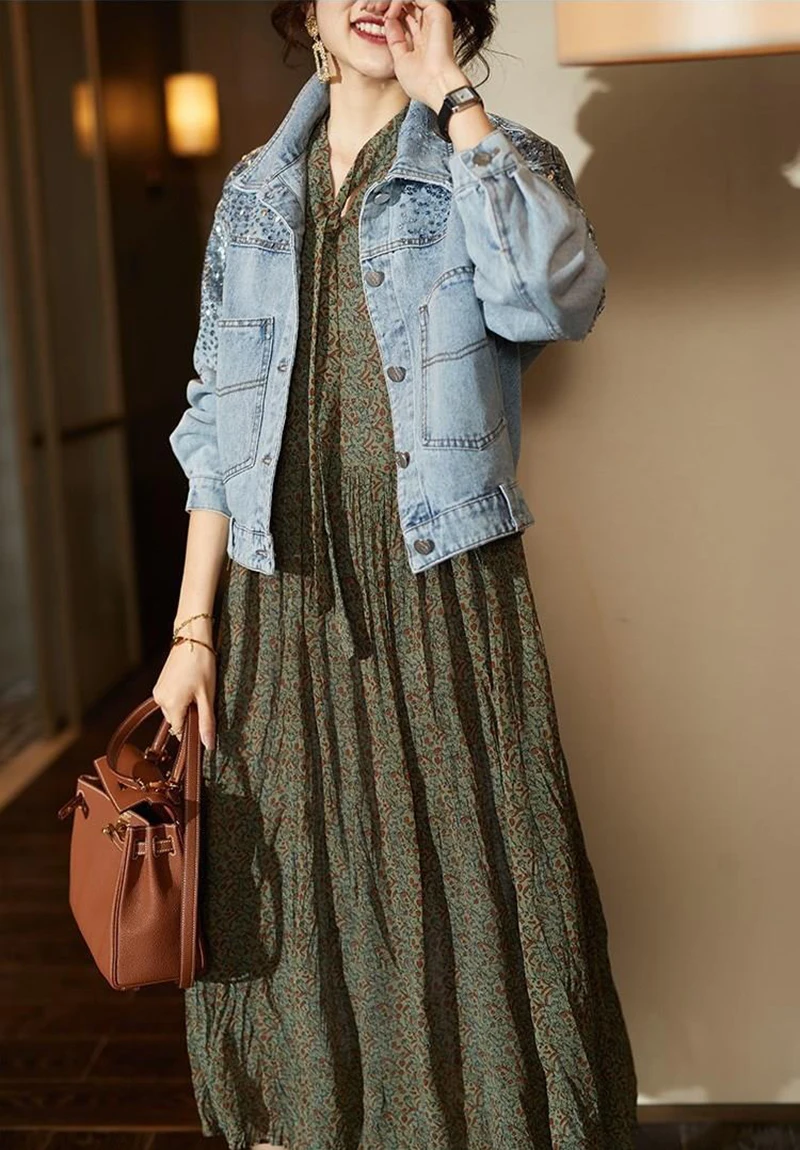 xakxx Spring Autumn Denim Jacket Women Fashion Sequin Short Lapel Jean Coats Woman Casual Full Sleeve Loose Button Coat