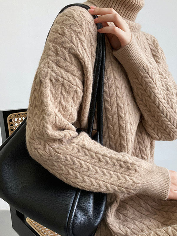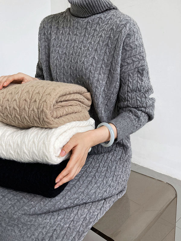 xakxx Stylish Loose Long Sleeves Solid Color High-Neck Twist Sweater Dresses