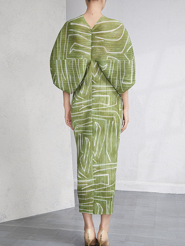 xakxx Urban Loose Batwing Sleeves Printed Pleated V-Neck Midi Dresses