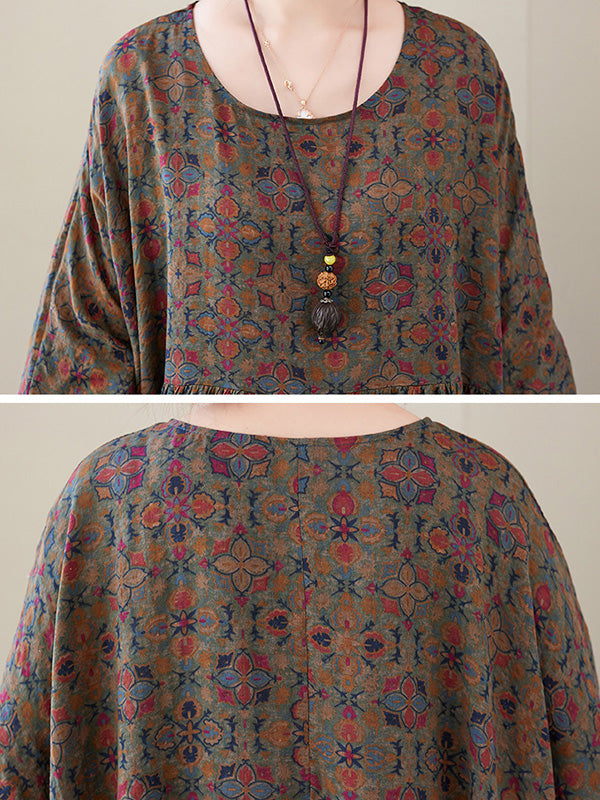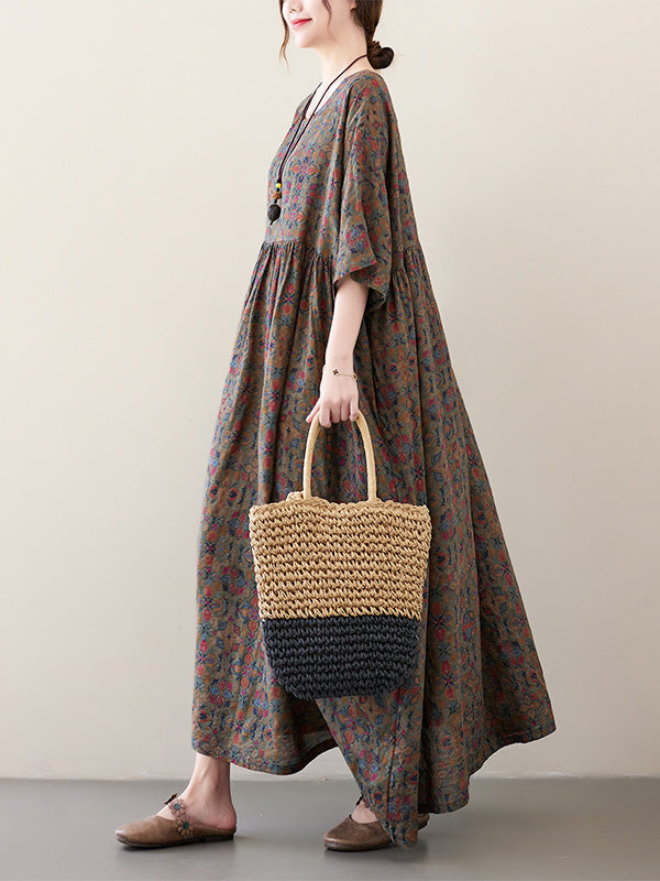 xakxx Vacation Loose Half Sleeves Floral Printed Pleated Round-Neck Midi Dresses