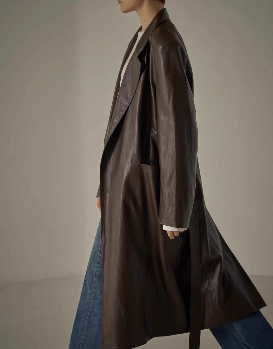 xakxx Woman Trench Coat Winter Female Clothing Belted Mid-Length Solid Color Loose Leather Jacket Coat