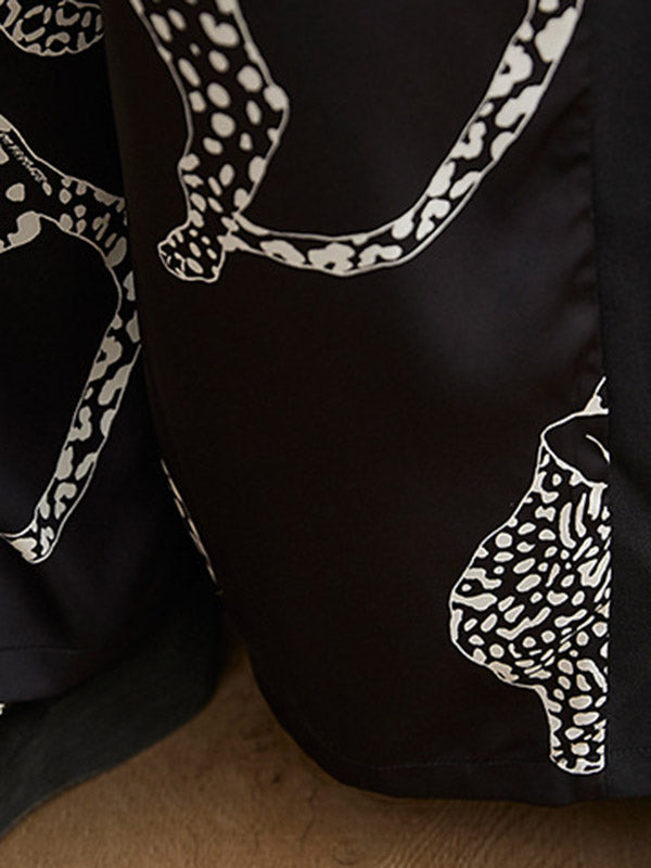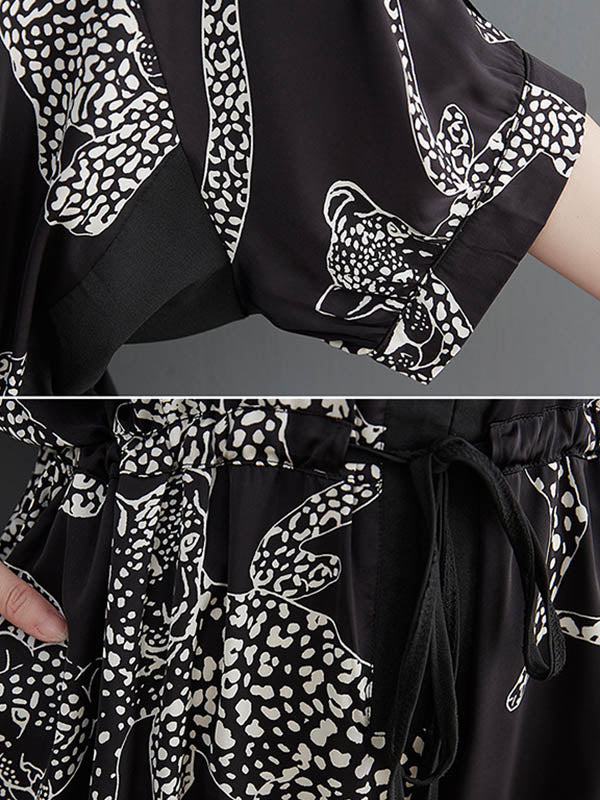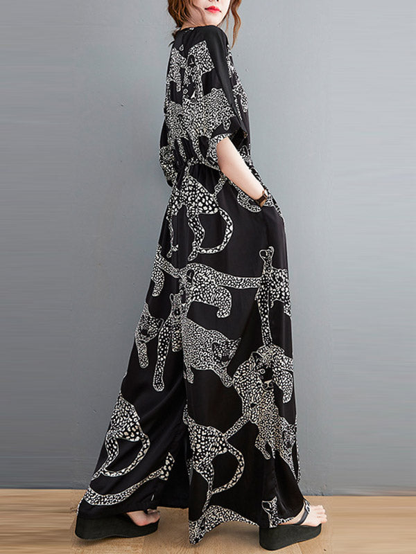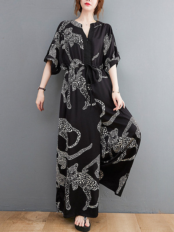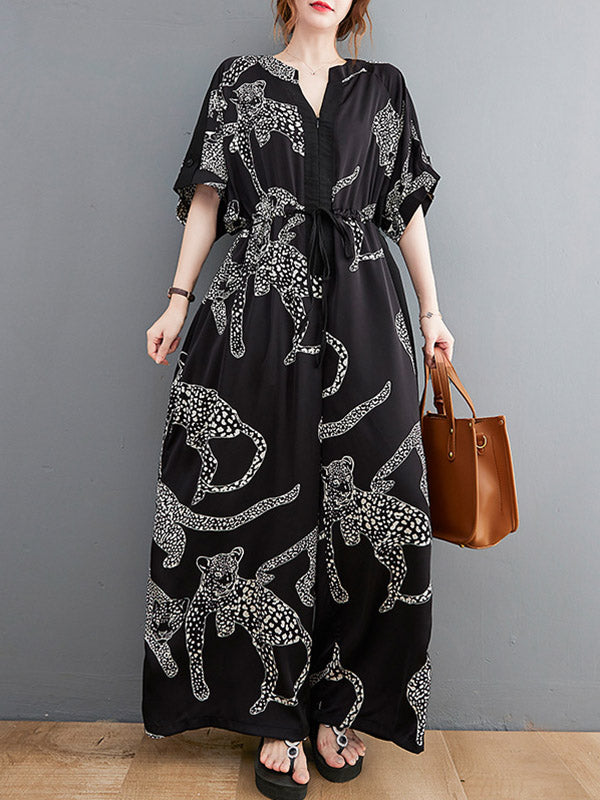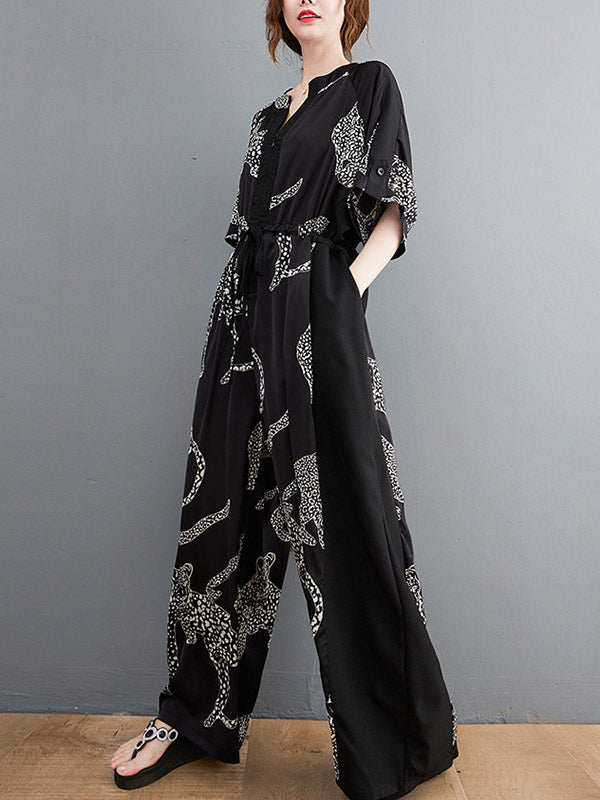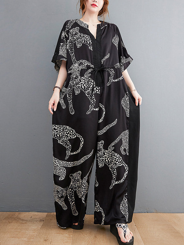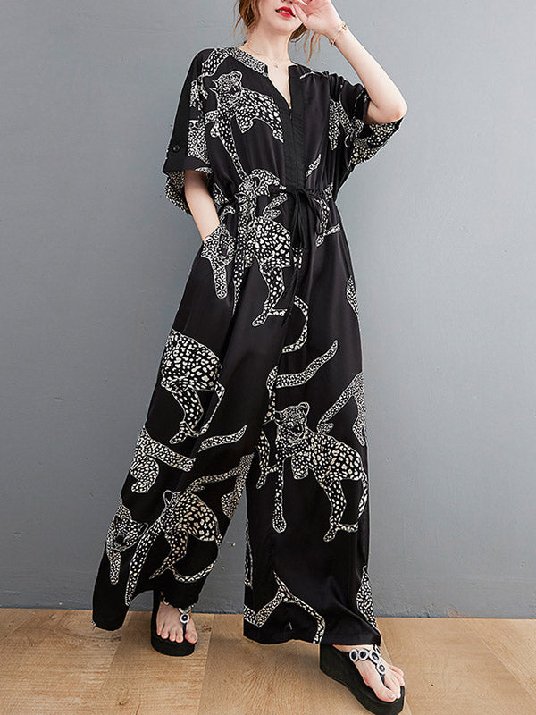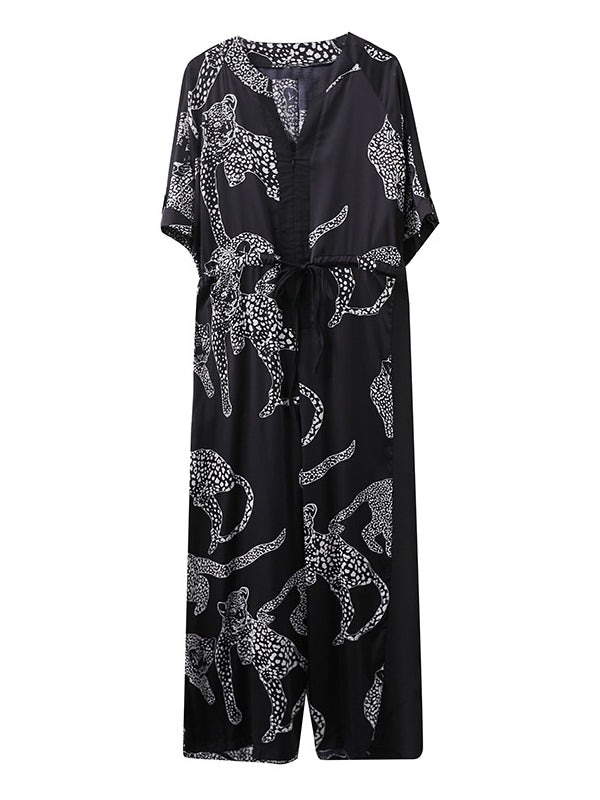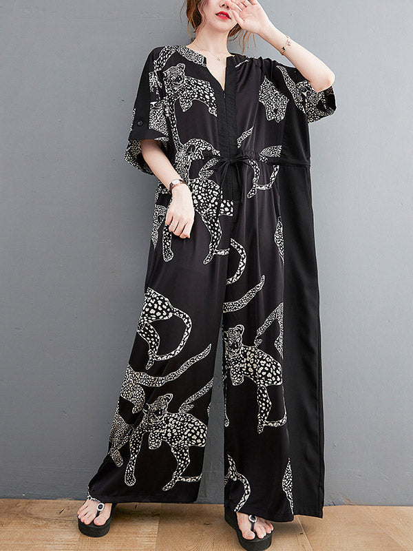 xakxx Vintage Original Floral Leopard Printed Split-Joint Tied V-Neck Half Sleeves Wide Leg Jumpsuits